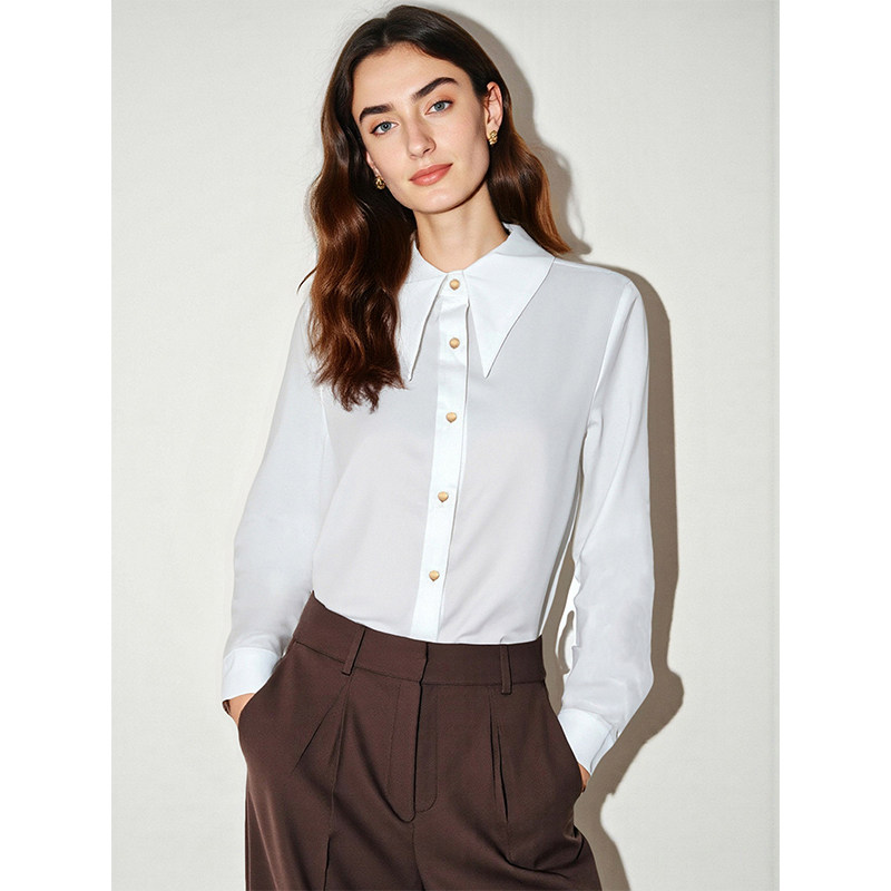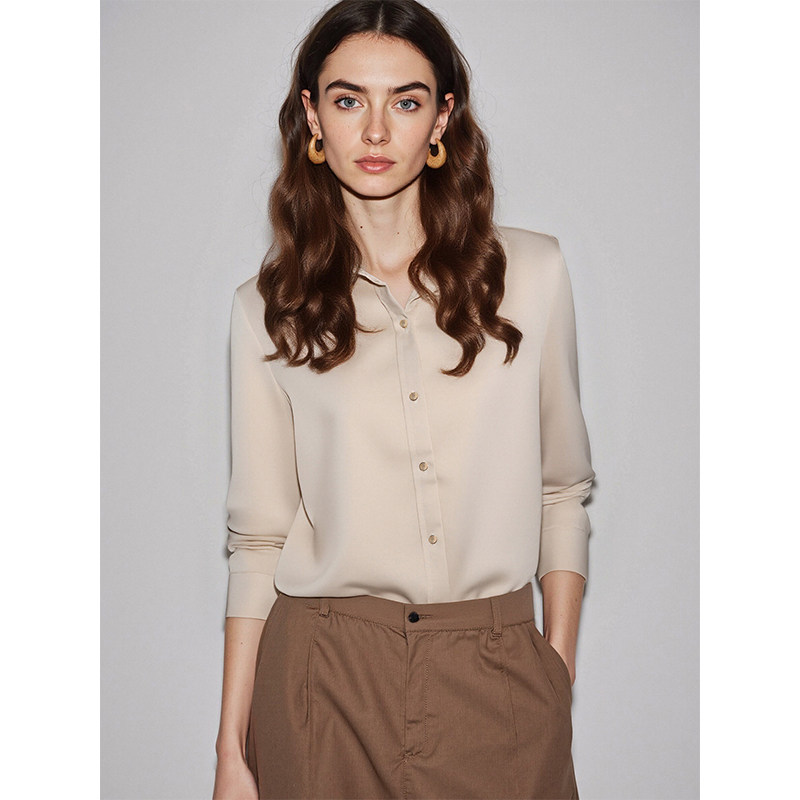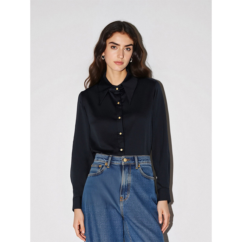 Basic House/百家好浅蓝色缎面衬衫女2026春季新款宽松小尖领衬衣