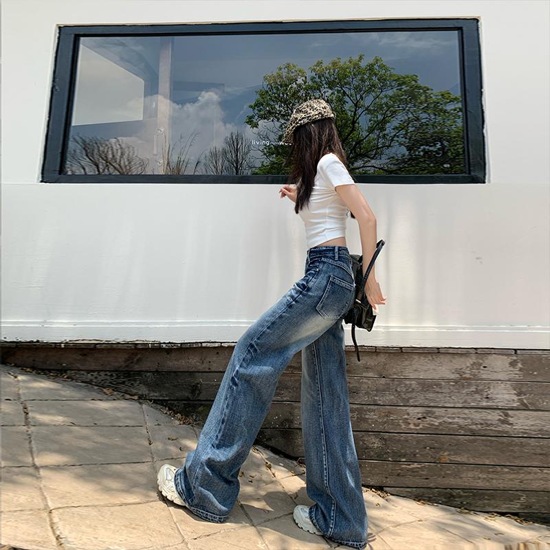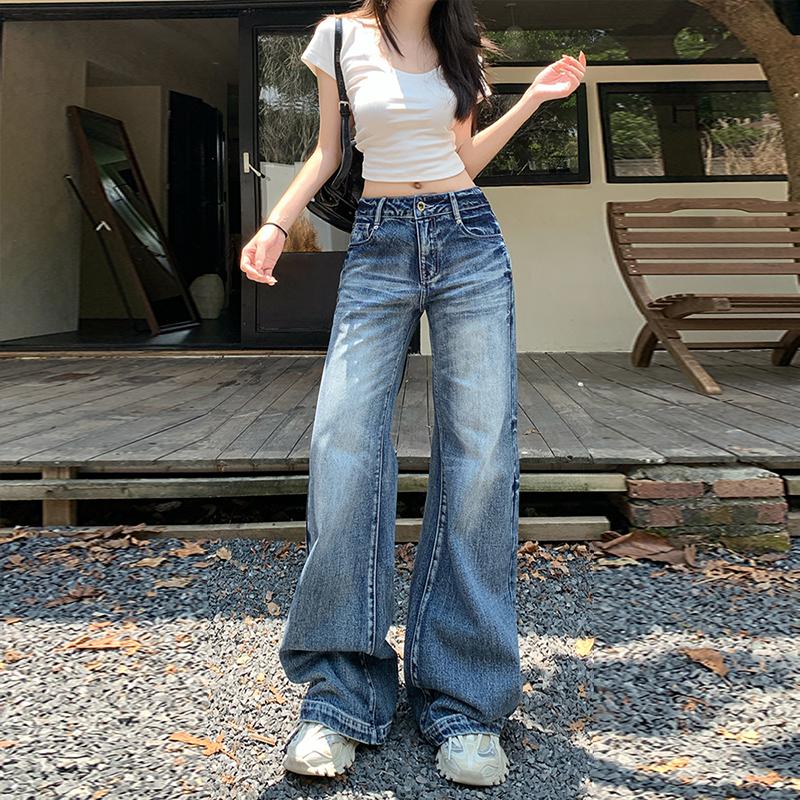 特大码女装复古做旧抓痕牛仔裤女胖mm美式高街宽松显瘦拖地长裤子