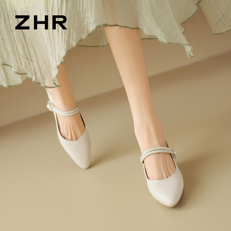 ZHR尖头单鞋女2025新款秋季法式气质中跟软底粗跟真皮玛丽珍女鞋