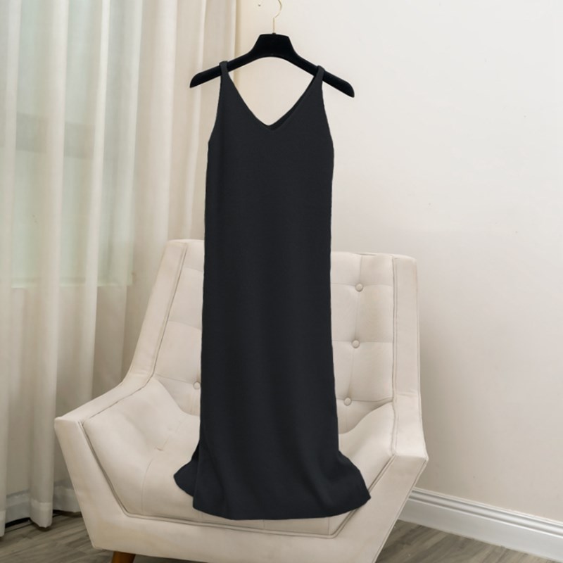 针织连衣裙女秋冬新款中长款无袖V领吊带裙气质内搭开叉打底裙子