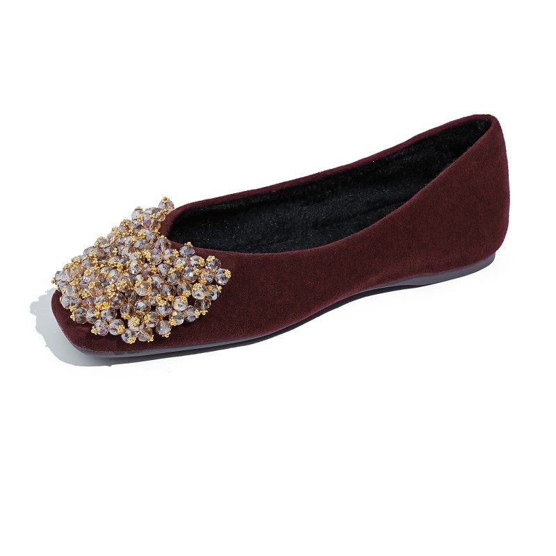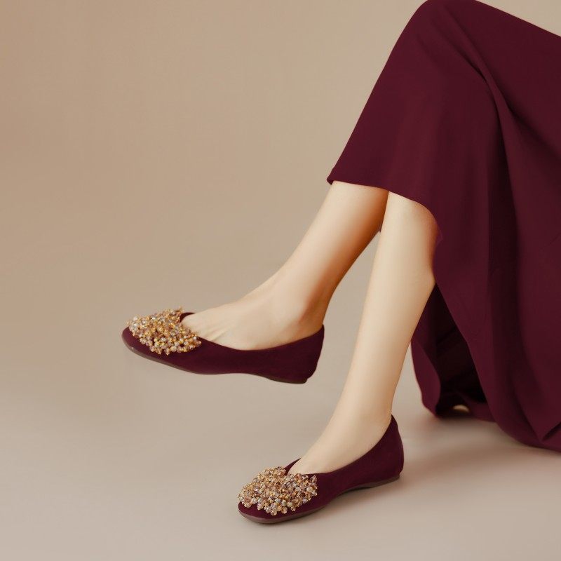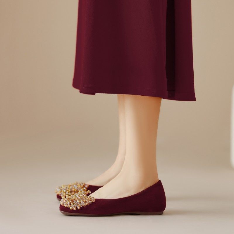 精致温柔仙女方头水钻平底宴会单鞋秀禾新中式复古国风酒红色婚鞋