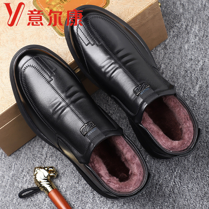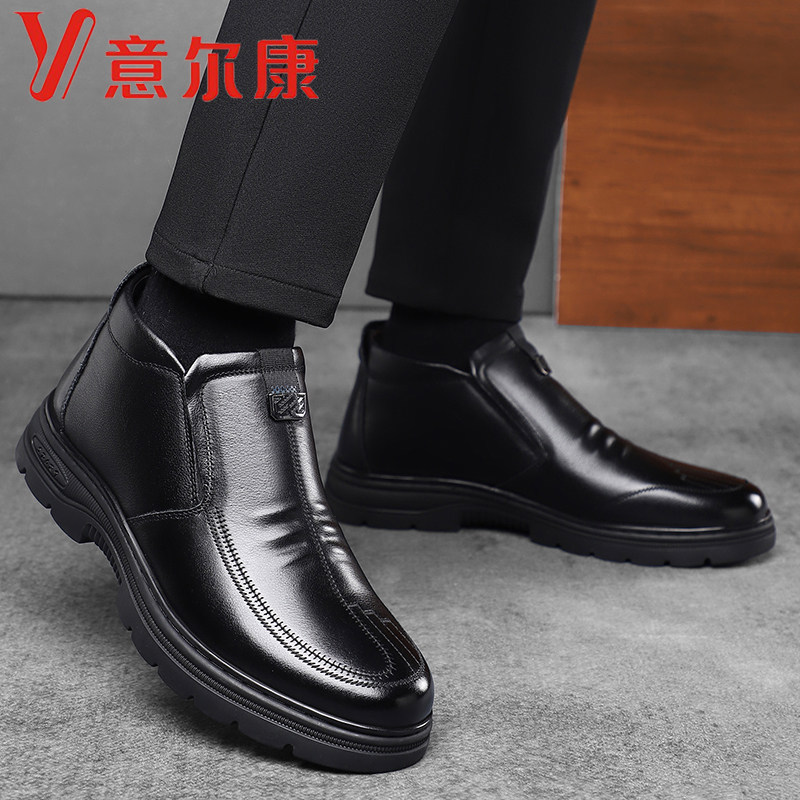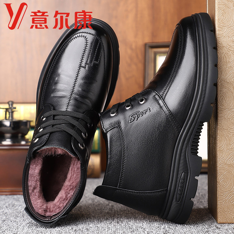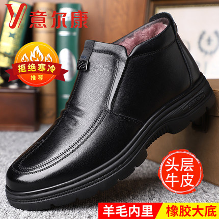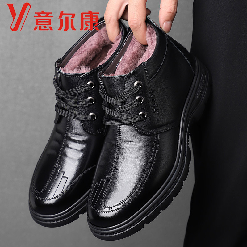 意尔康男鞋冬季头层牛皮加绒保暖皮毛一体真皮羊毛高帮休闲棉鞋男