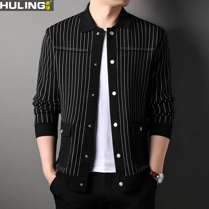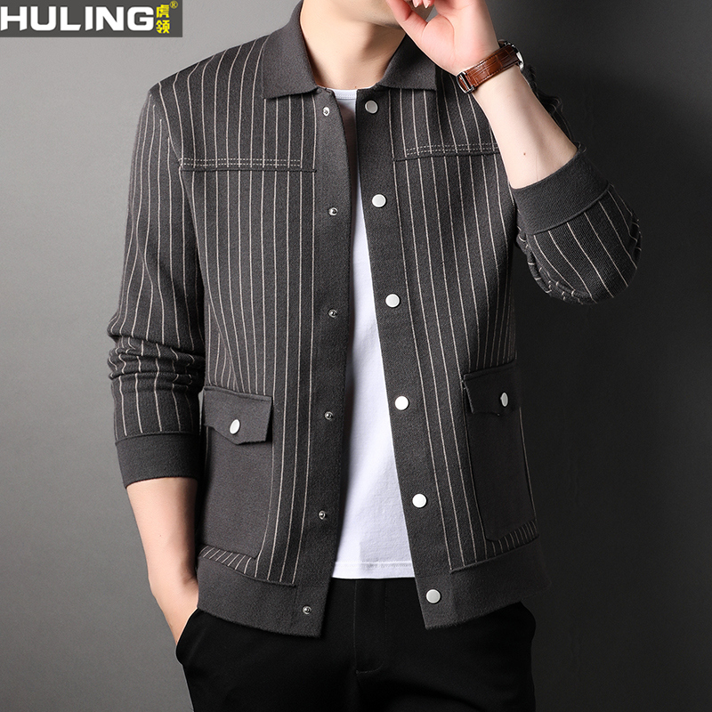 竖条纹针织开衫男装春秋季韩版潮流时尚按扣翻领休闲毛衣夹克外套