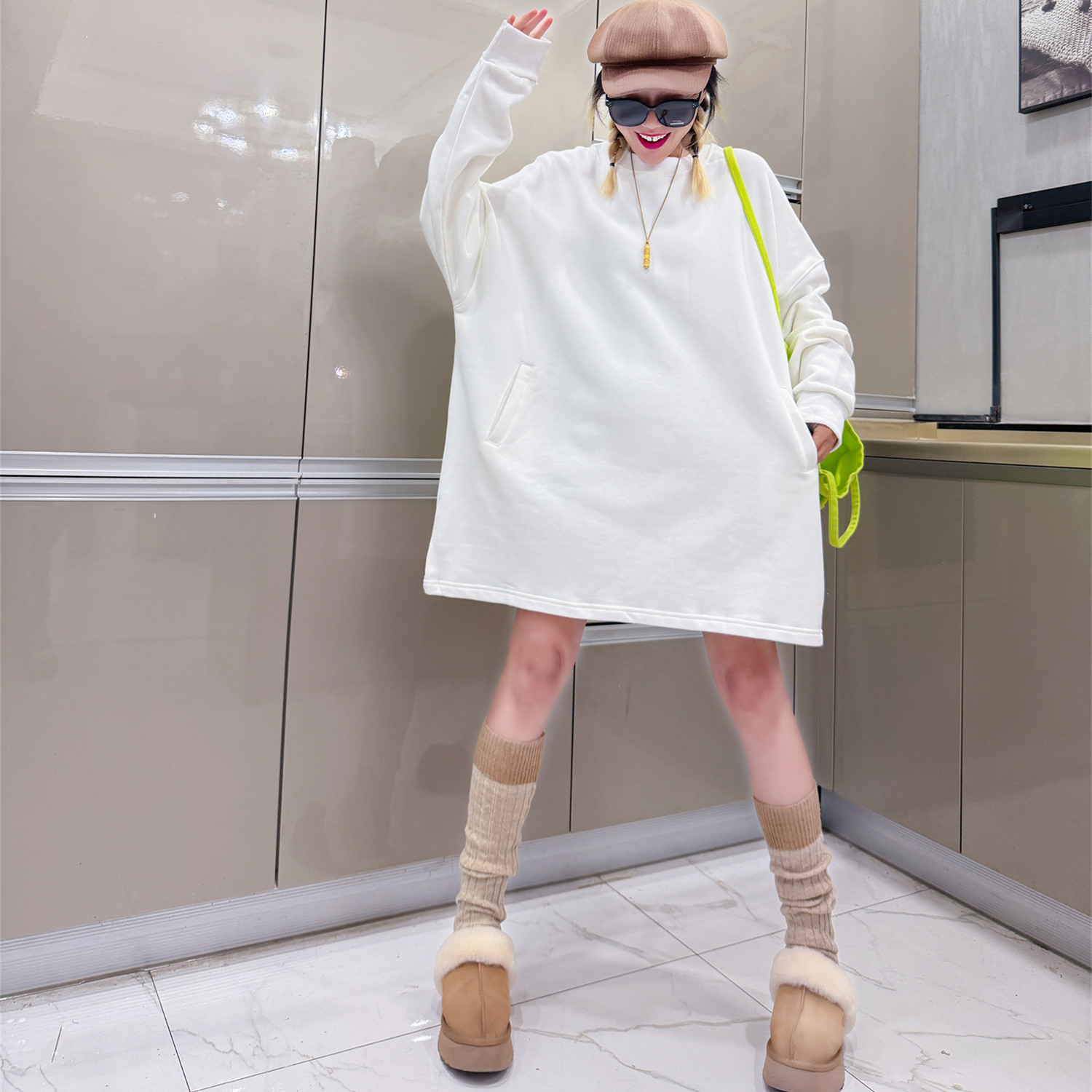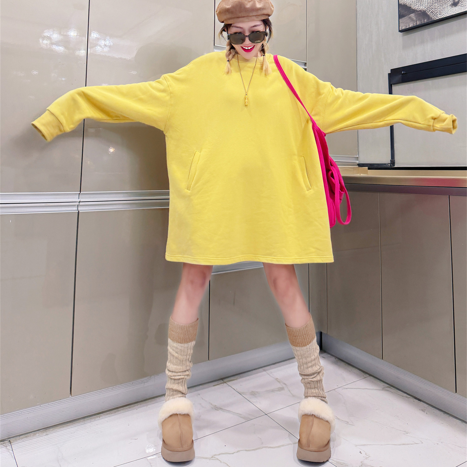 秋冬季韩版加绒加厚卫衣女宽松中长款纯色打底衫大码圆领保暖上衣