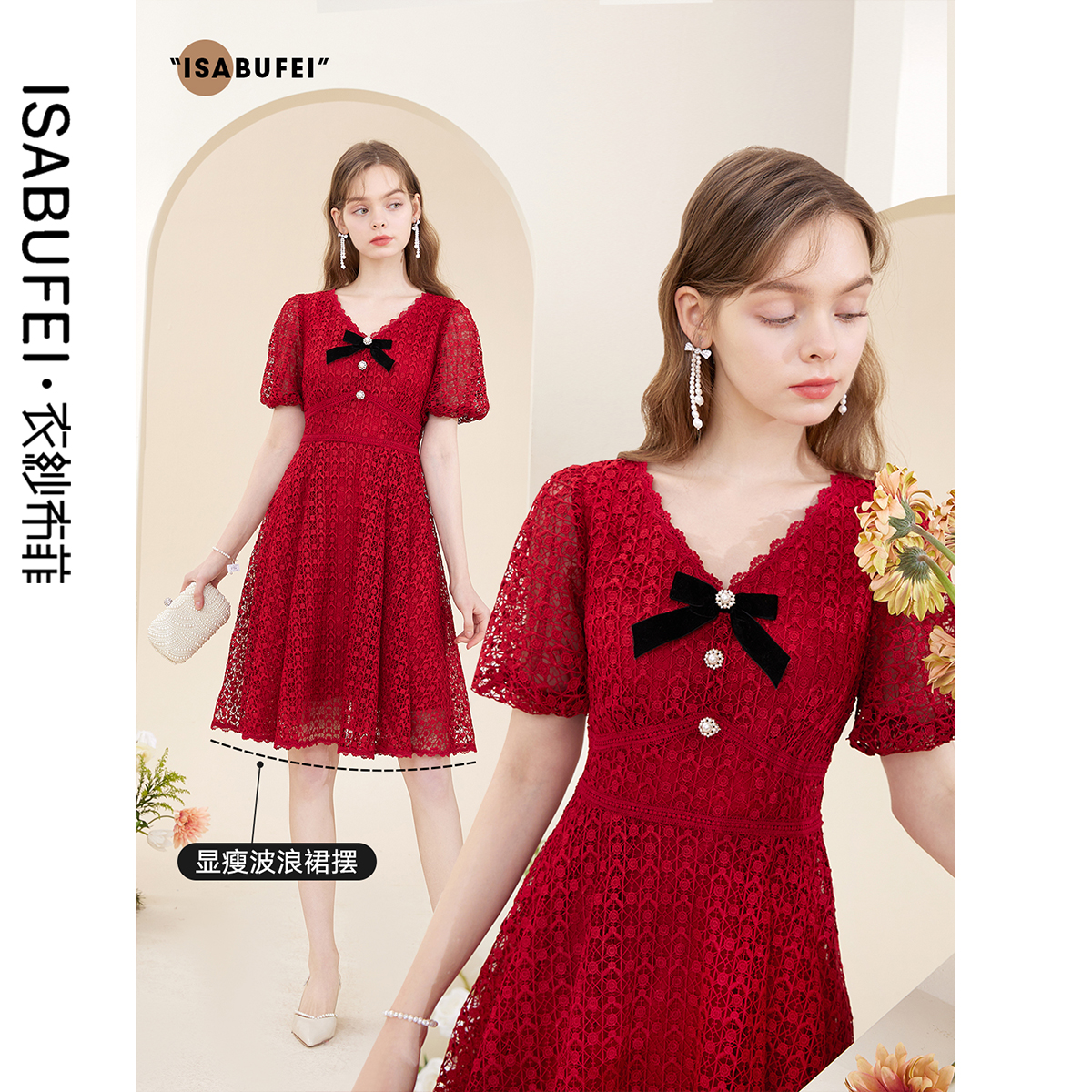 浪漫红色泡泡袖v领蕾丝连衣裙