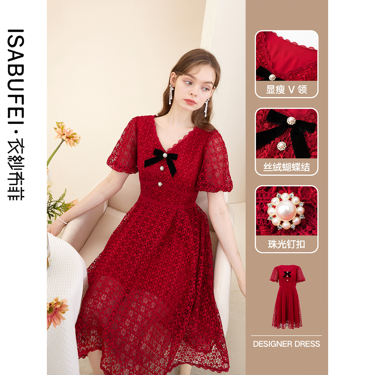 红胭 红色蕾丝连衣裙夏季新款设计感花边v领泡泡袖浪漫裙子