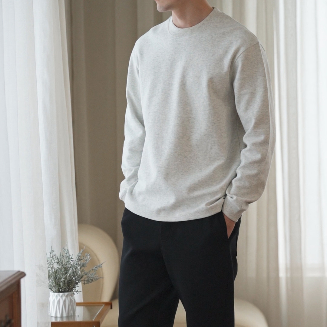 雪花灰重磅新疆长绒棉保暖发热长袖抗皱纯色小众高奢品质T恤男