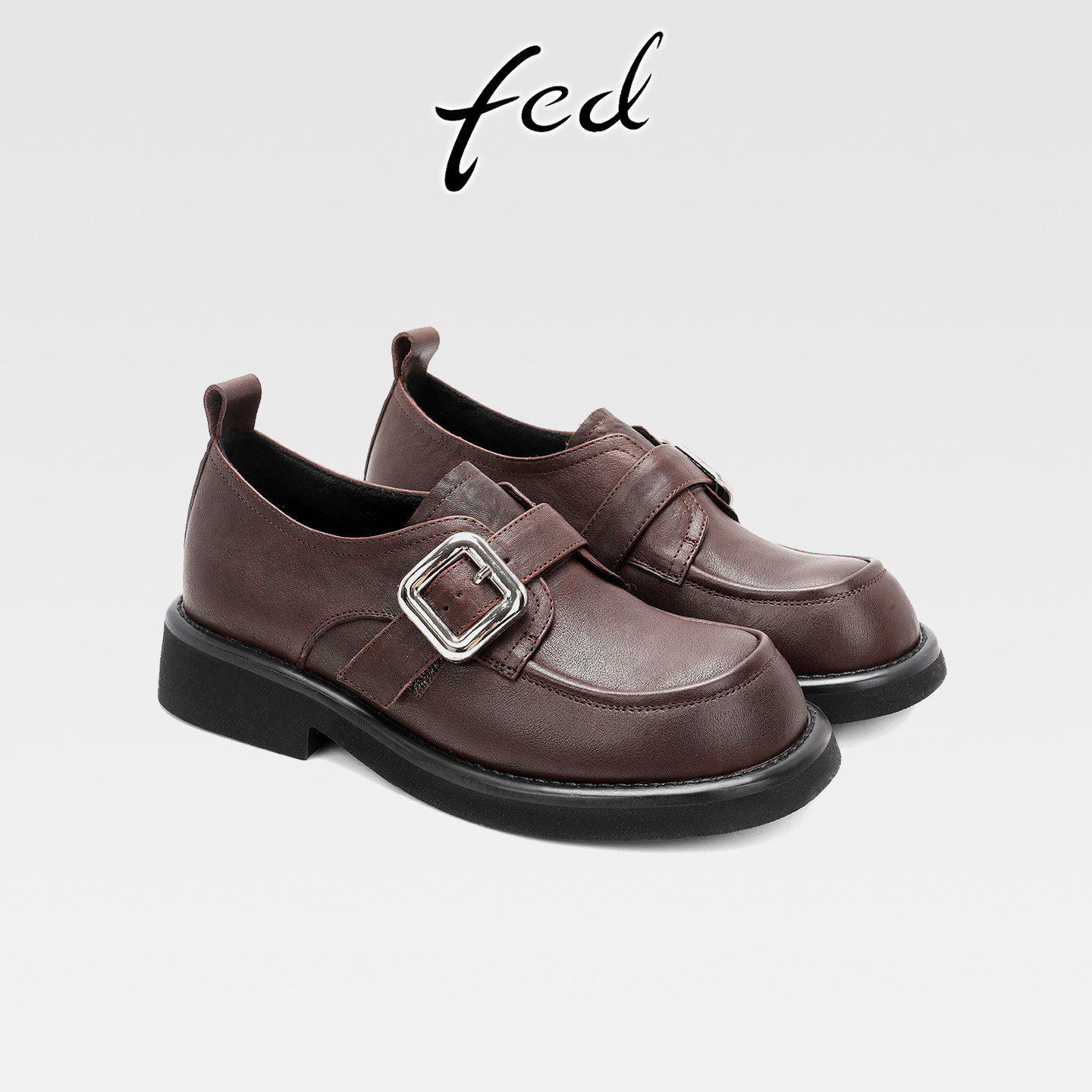 fed英伦风真皮厚底皮带扣乐福鞋女复古小皮鞋一脚蹬圆头深口单鞋