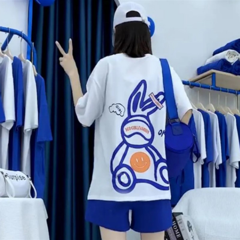 227560【卡通小兔子中长款开叉T恤女】夏季短袖上衣百搭宽松休闲