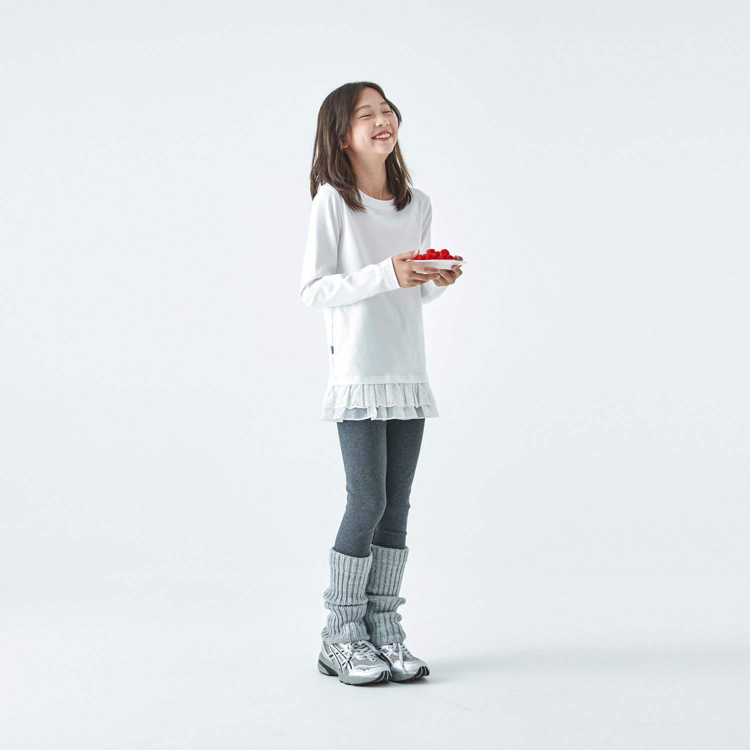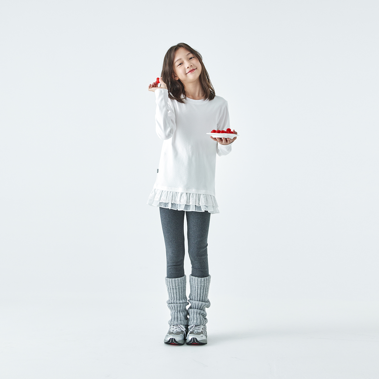 棵初2025年秋季新款亲子中大女童纯色拼接打底衫下摆蕾丝简约上衣
