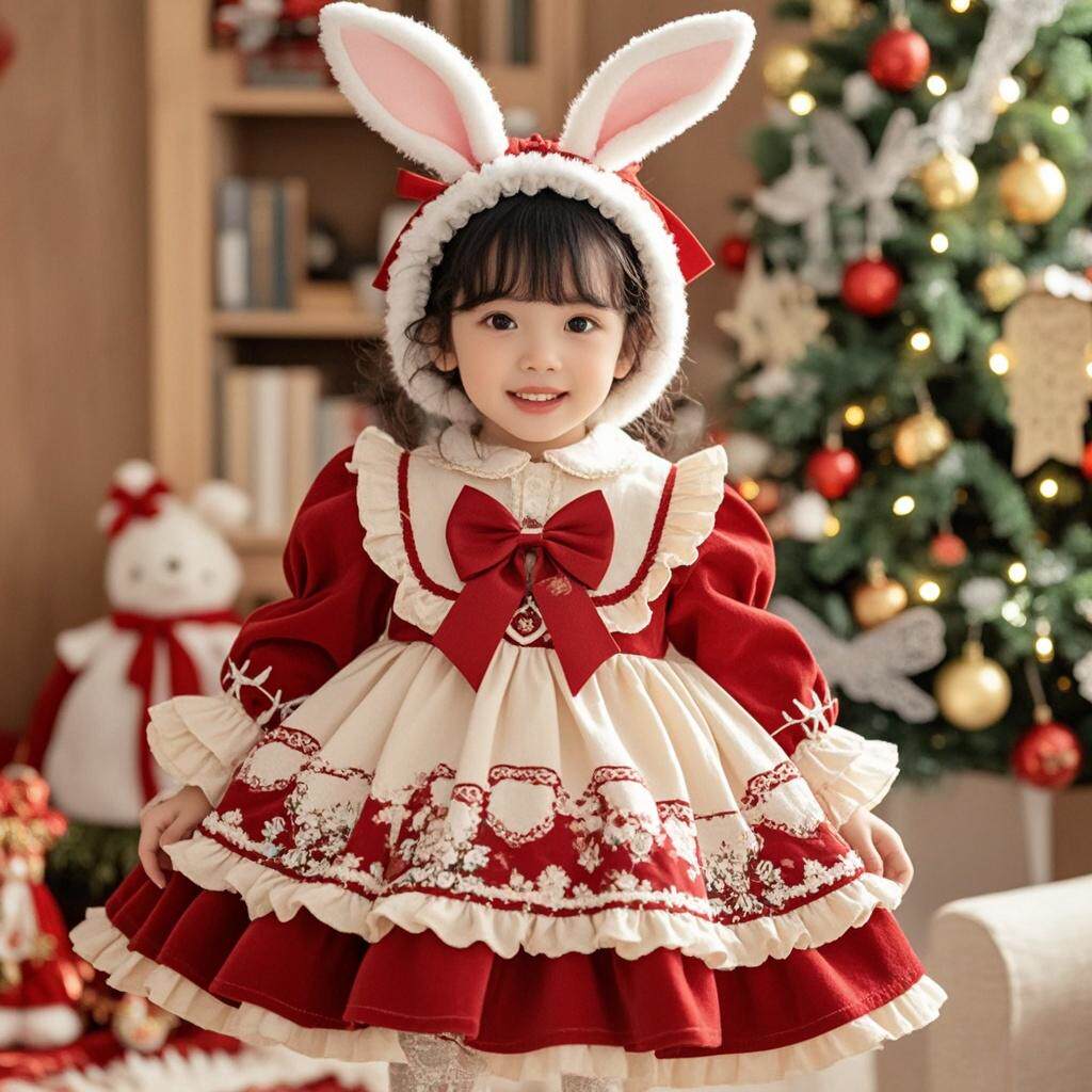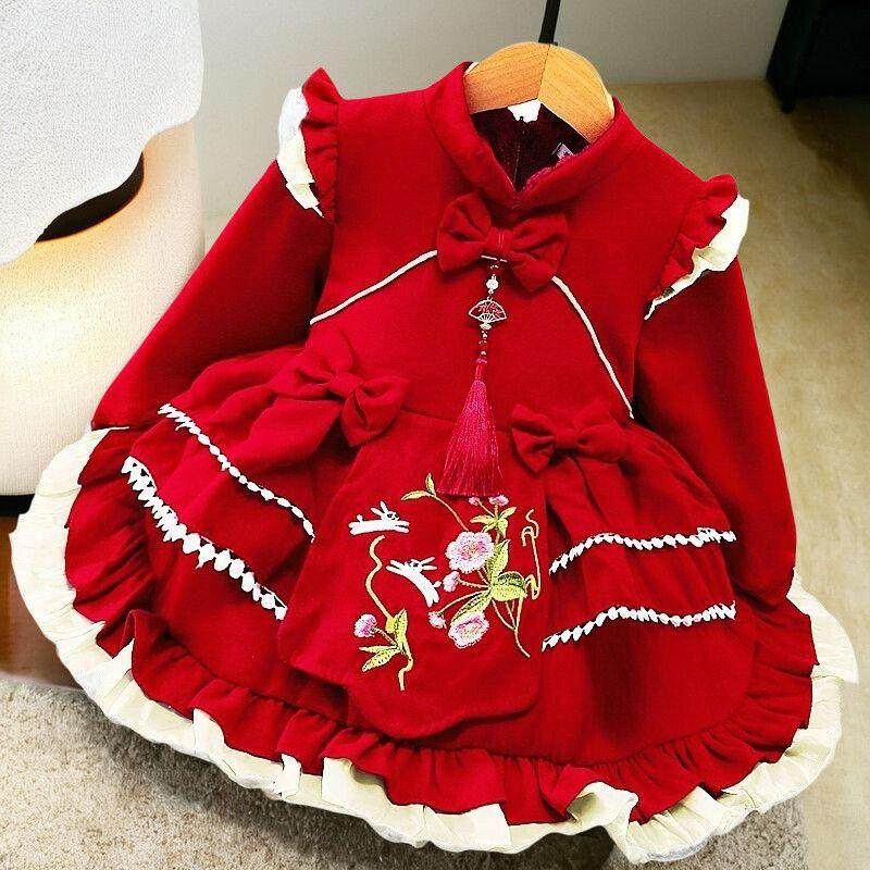 女童连衣裙秋冬新款红色洛丽塔中式公主裙宝宝生日蓬蓬礼服拜年服