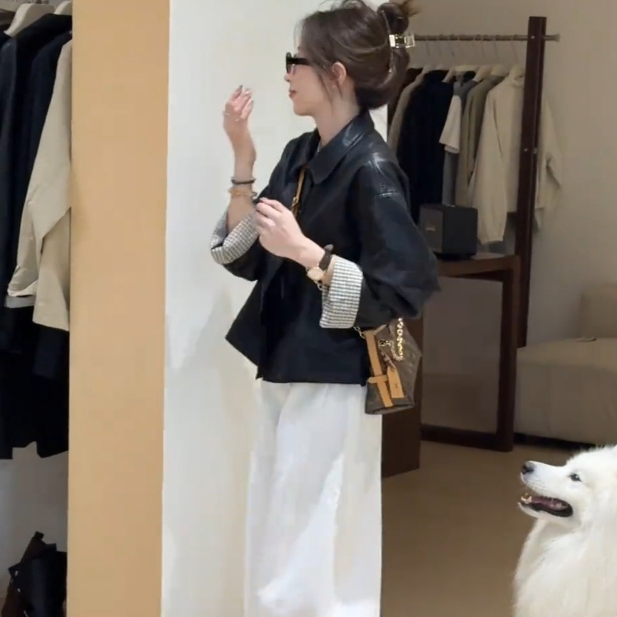 短款翻领格子拼接皮衣外套女秋季
