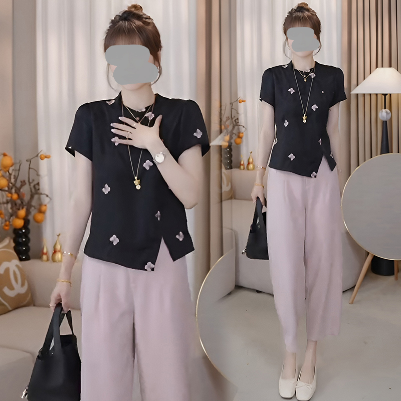 2025新款夏季新国风盘扣高级感温柔气质短袖上衣阔腿裤时尚套装女