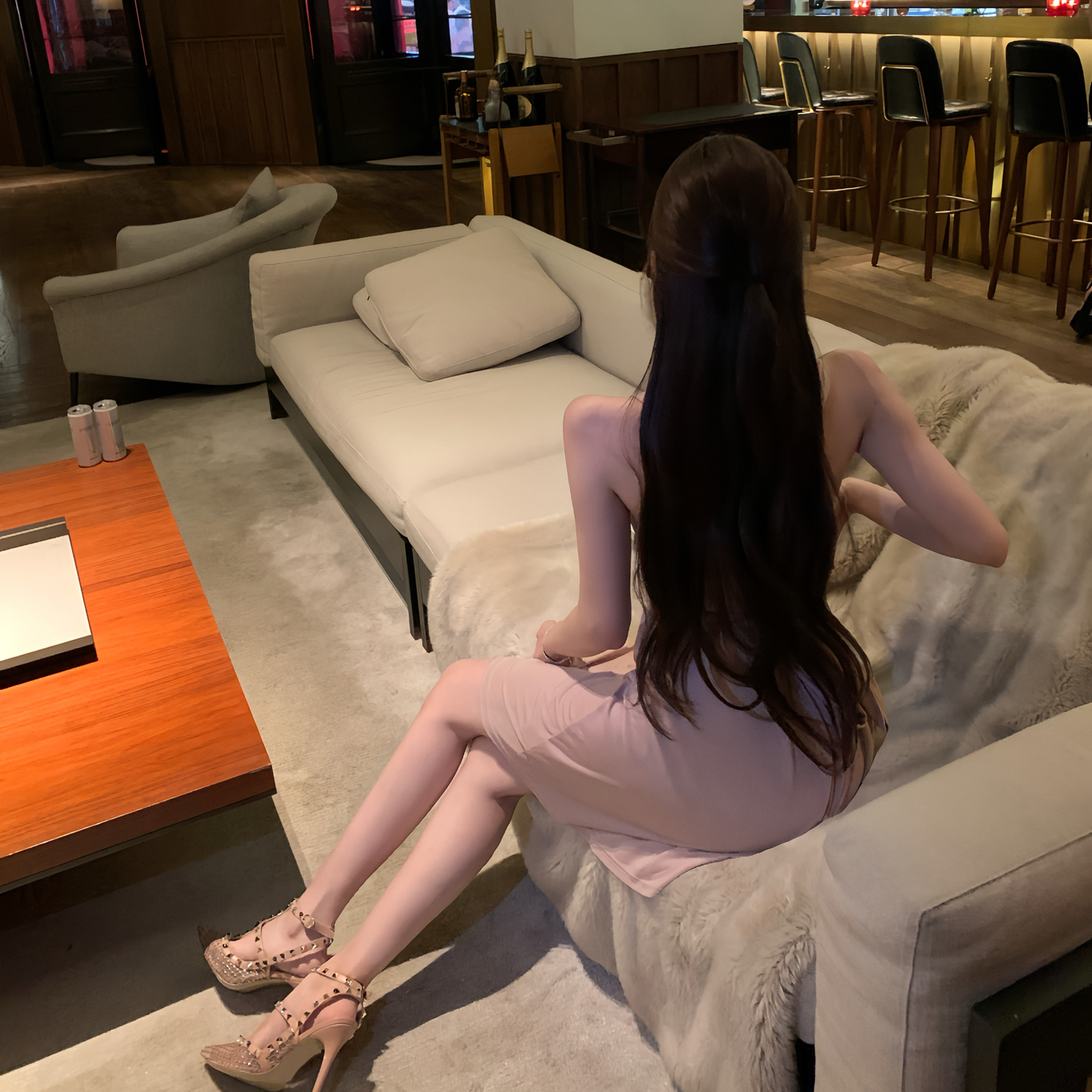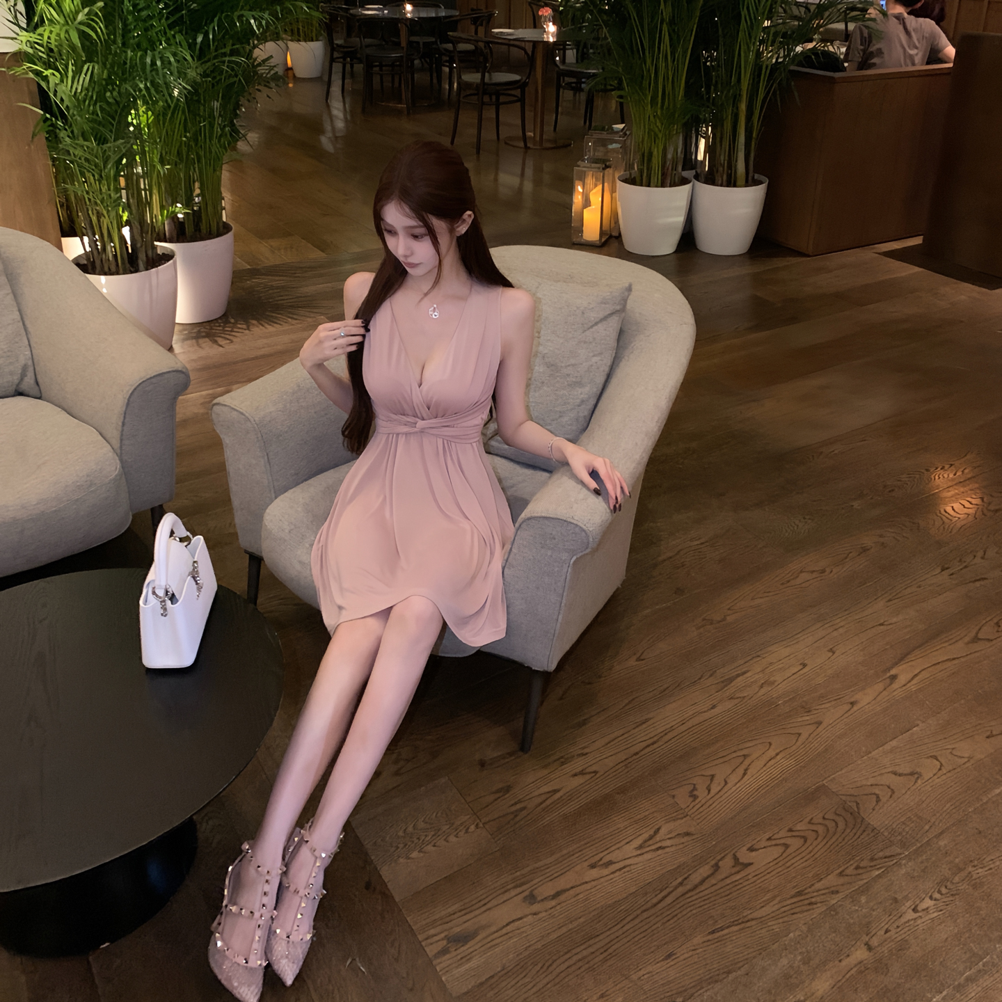 韩雨嘉【Budapest落樱粉】性感粉色v领挂脖宽松短款针织连衣裙