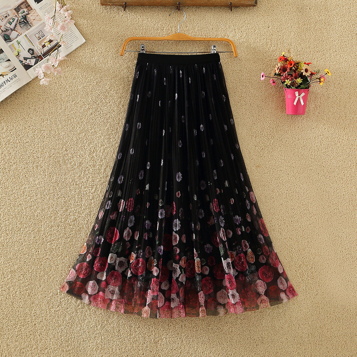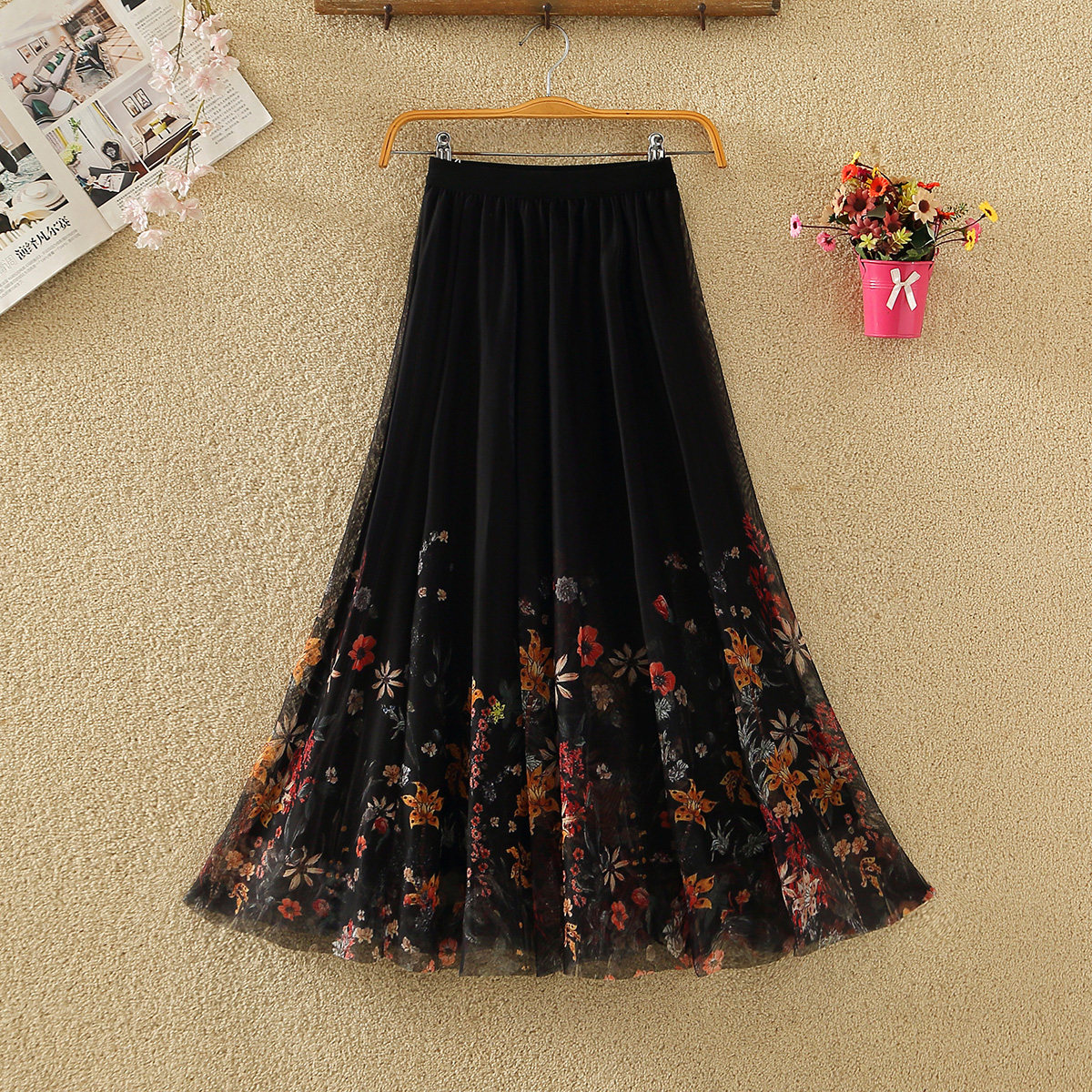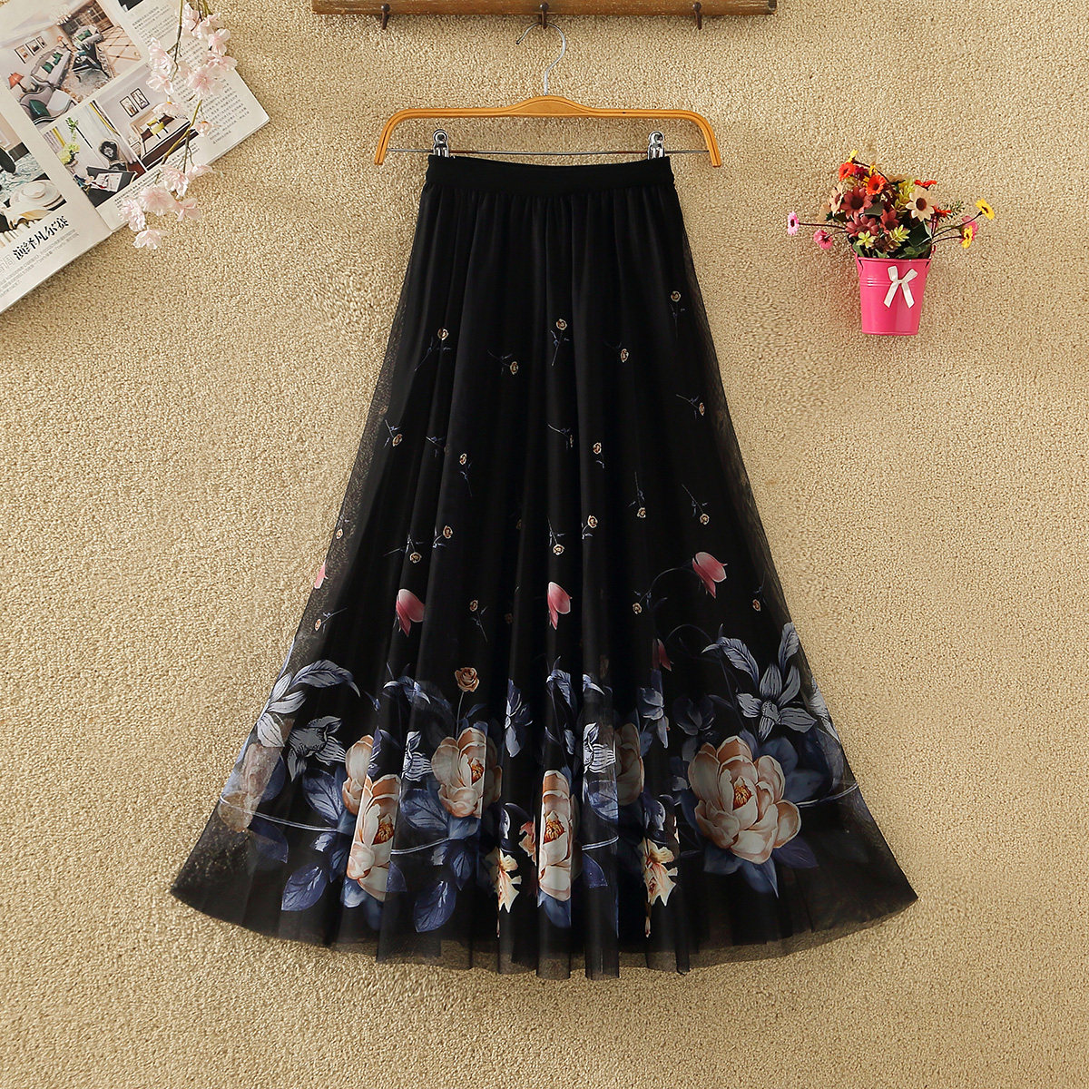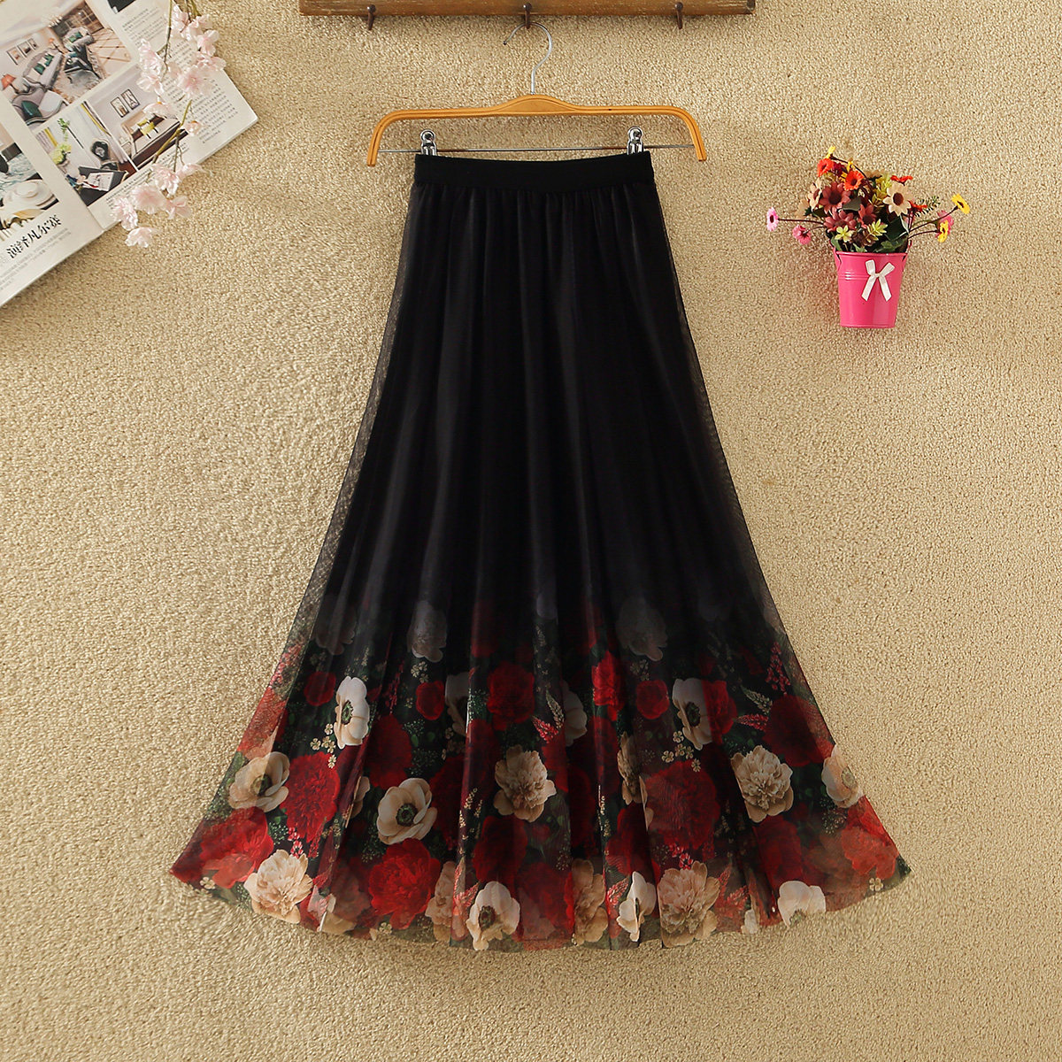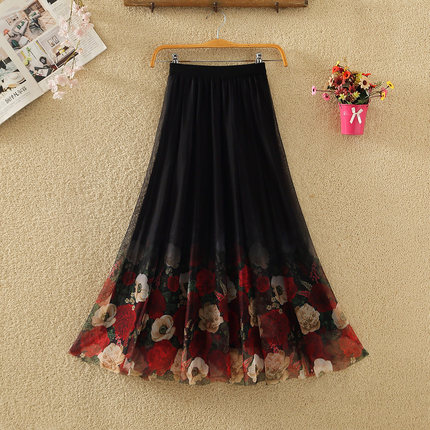 春夏新款网纱半身裙长裙中年妈妈高档显瘦松紧腰碎花跳舞大摆A裙