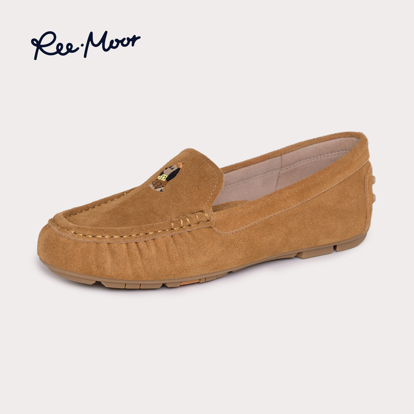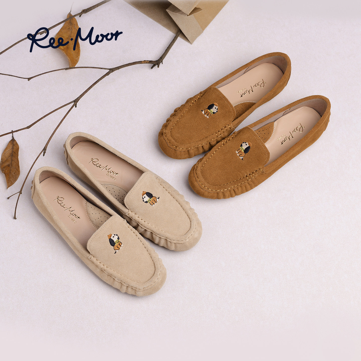 REEMOOR2025秋冬新款复古圆头显瘦乐福鞋刺绣小狗豆豆鞋平底女鞋