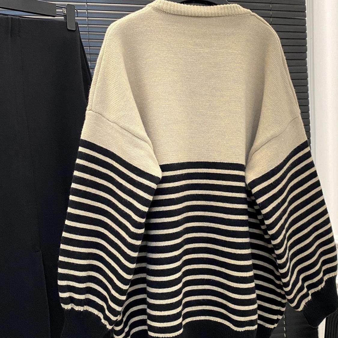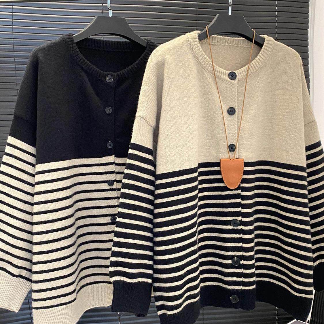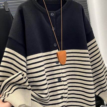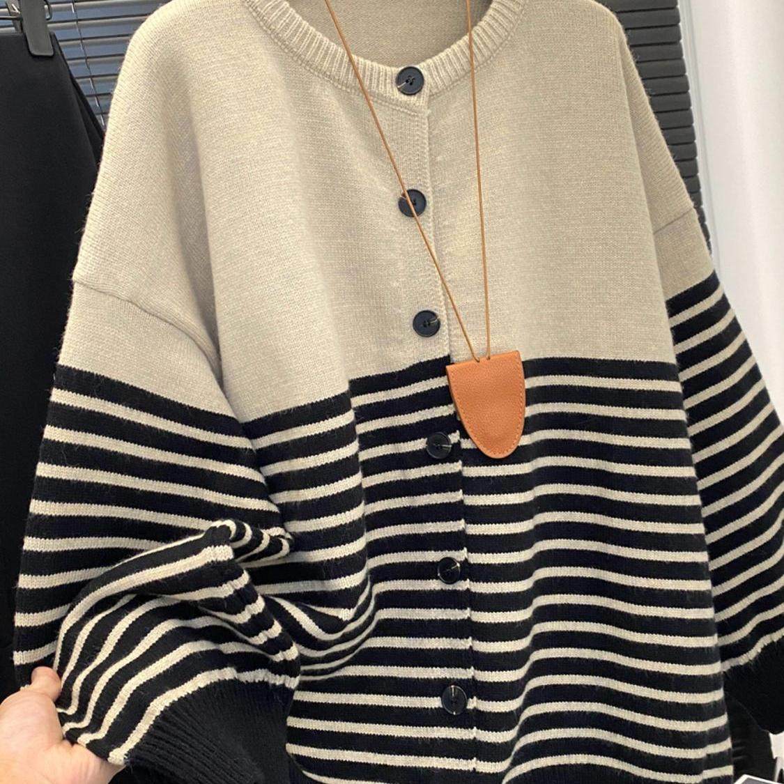 特大码300斤法式洋气条纹撞色大版针织开衫女秋冬款胖MM毛衣外套