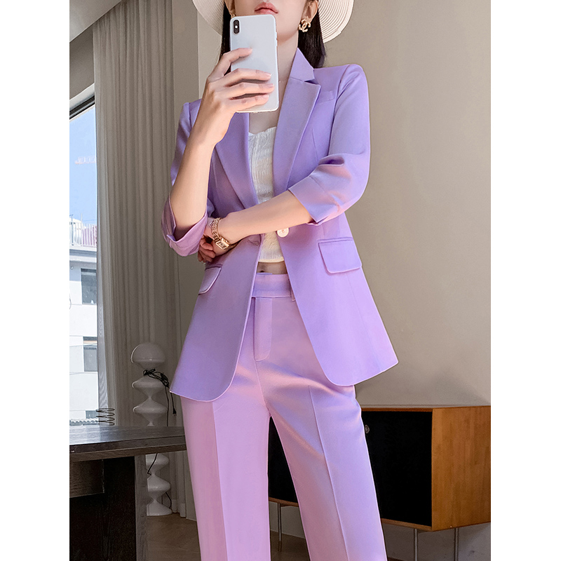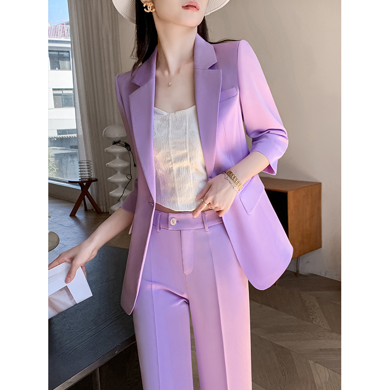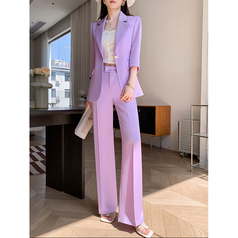 紫色阔腿裤西装套装女高级感夏季薄款职业气质七分袖垂感休闲西服