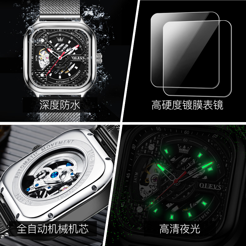 欧利时方形男士手表机械表2025新款镂空潮流时尚夜光防水品牌腕表