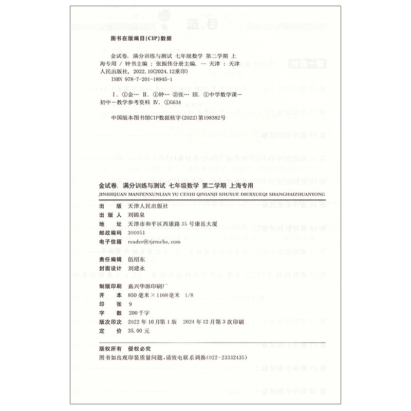 钟书金牌 金试卷 数学 七年级下/ 7年级 第二学期 上海沪教版教材配套 新 教辅 中学分成训练+单元测试卷+易错专项+期中期末卷