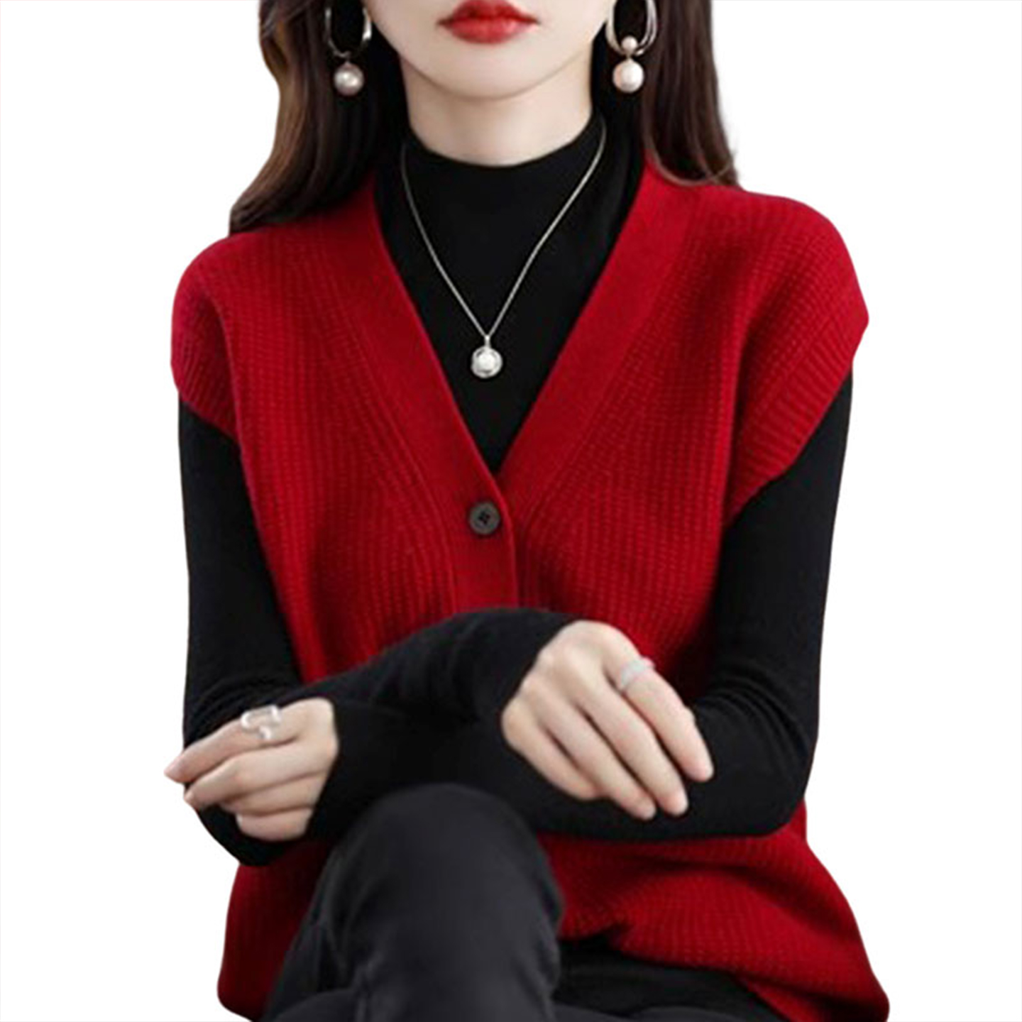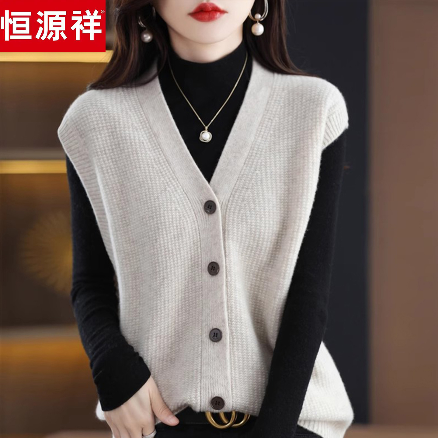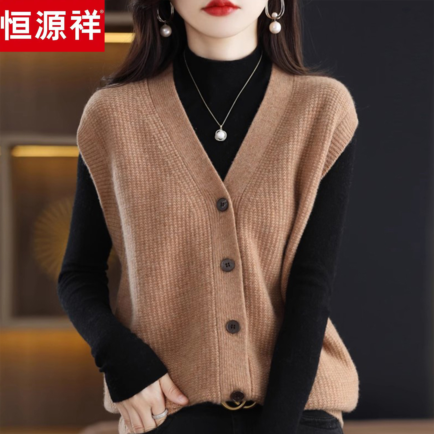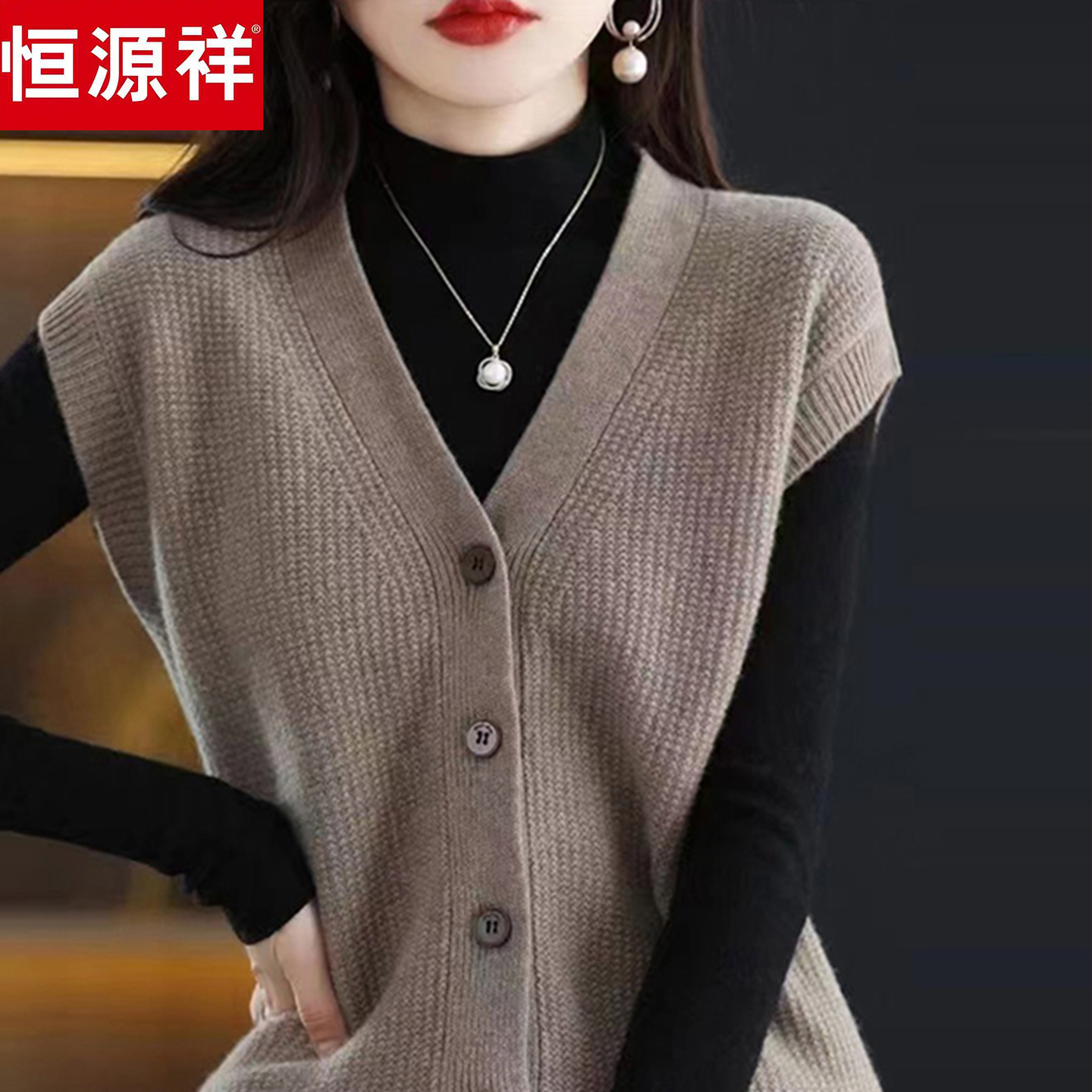 恒源祥V领纯羊毛衫马甲女秋冬宽松针织背心外套叠穿外搭坎肩毛衣