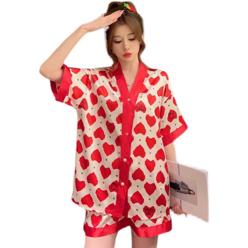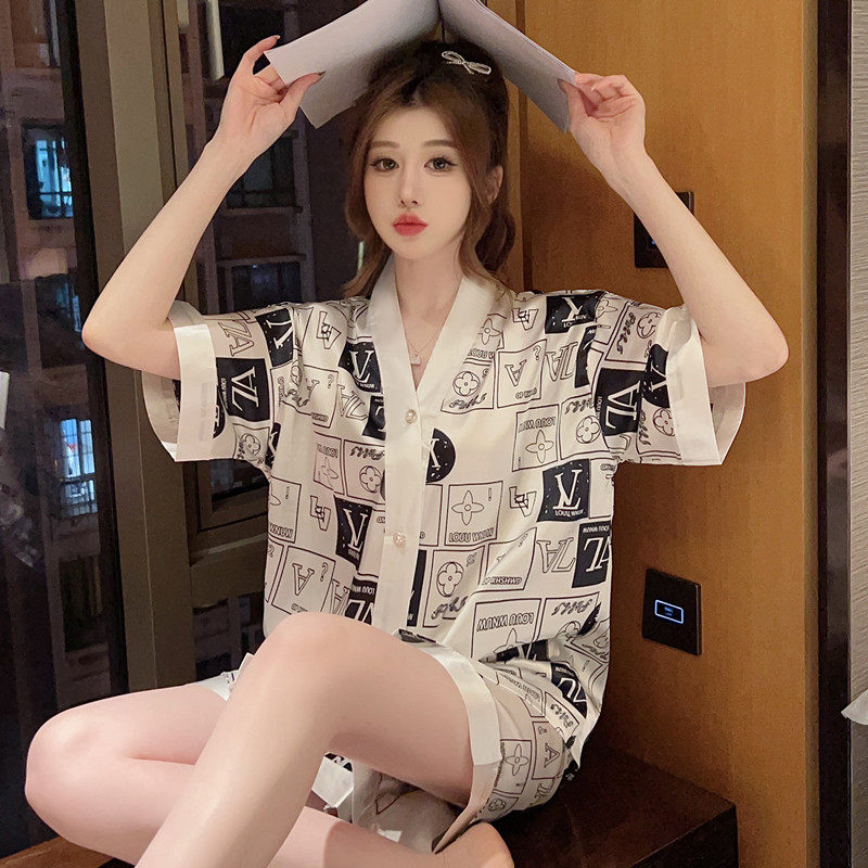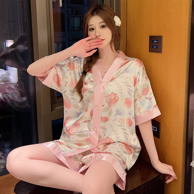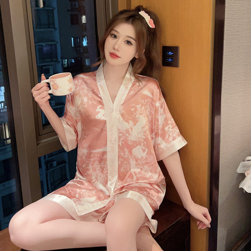 甜美风夏季睡衣女薄款短袖冰丝开衫日系V领仿真丝大码家居服套装