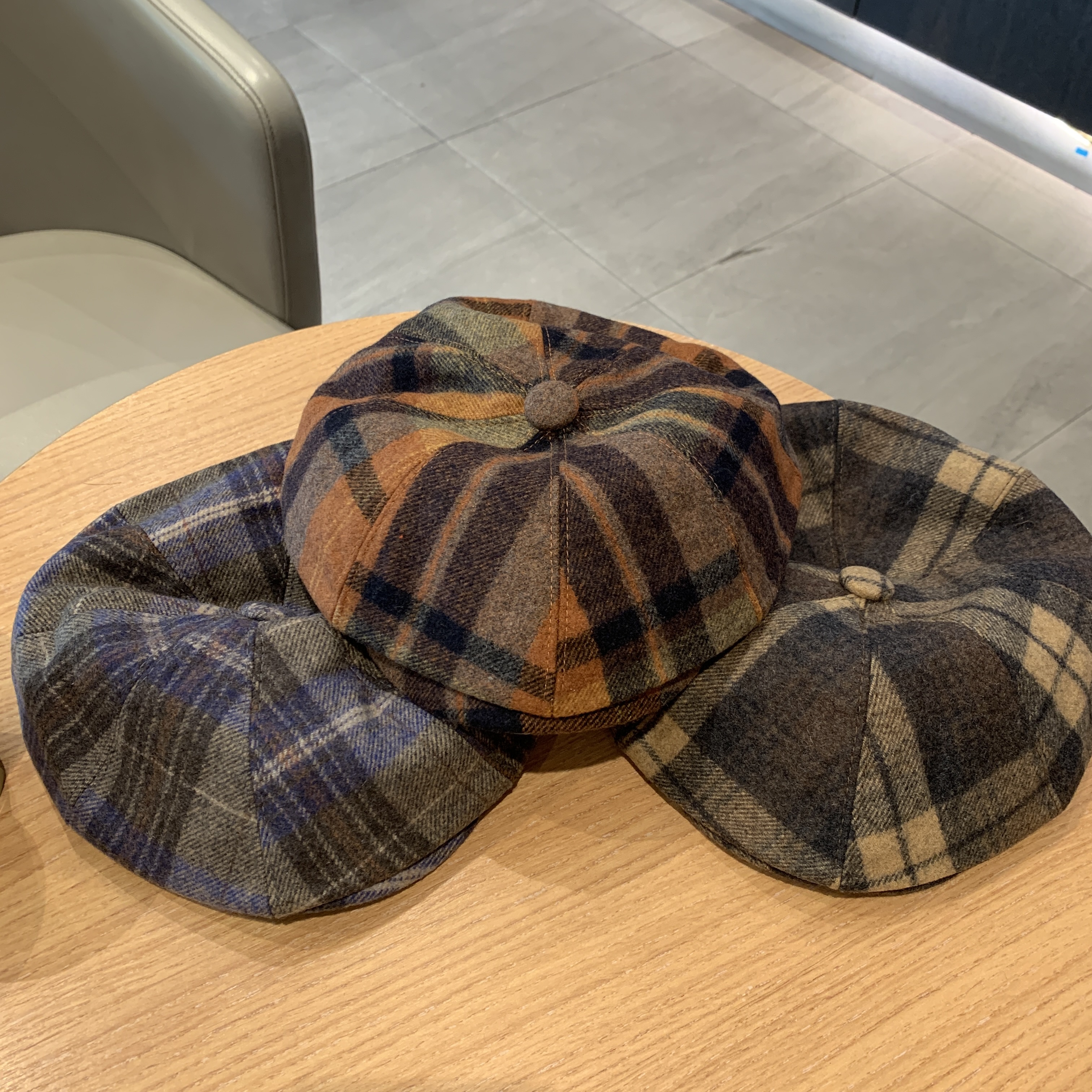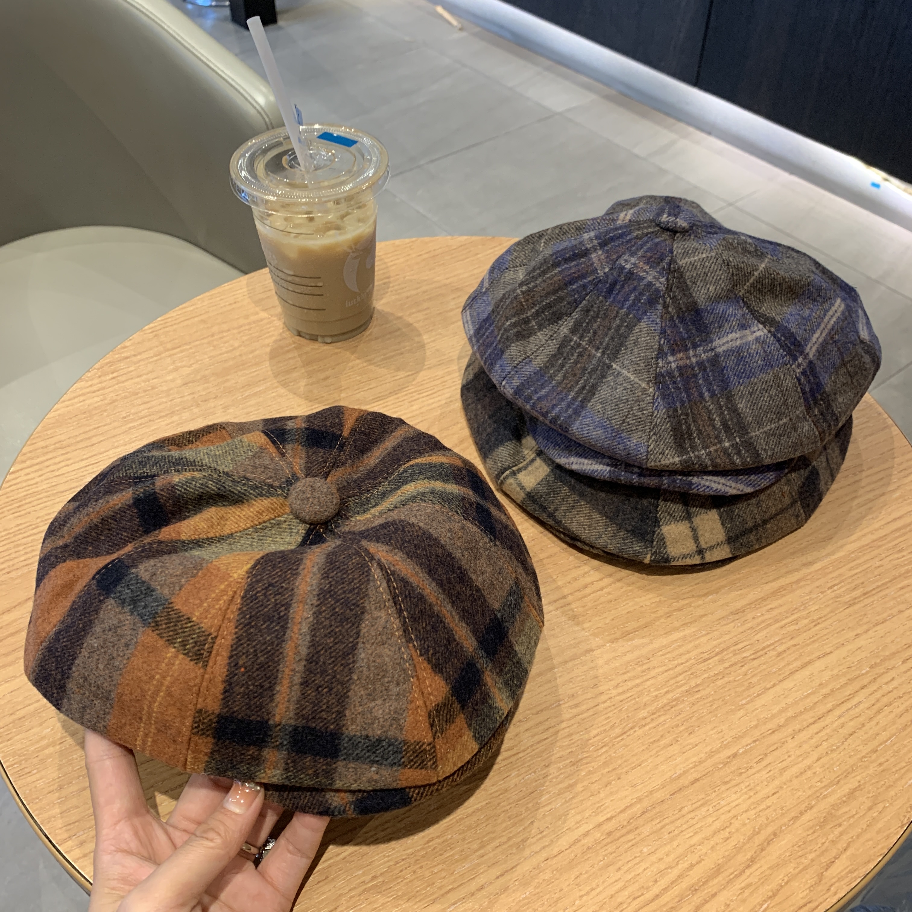 日系复古撞色格子毛呢八角帽子女秋冬英伦风时尚百搭显脸小贝雷帽