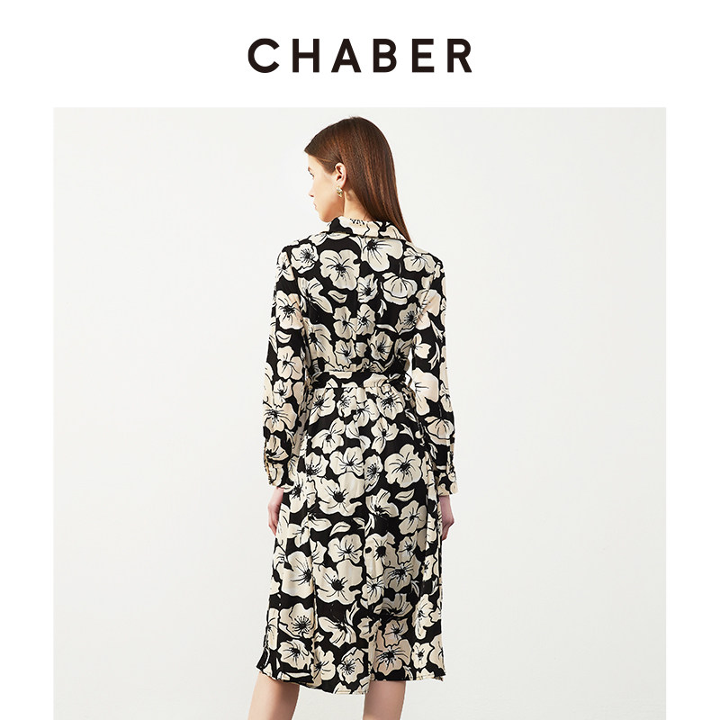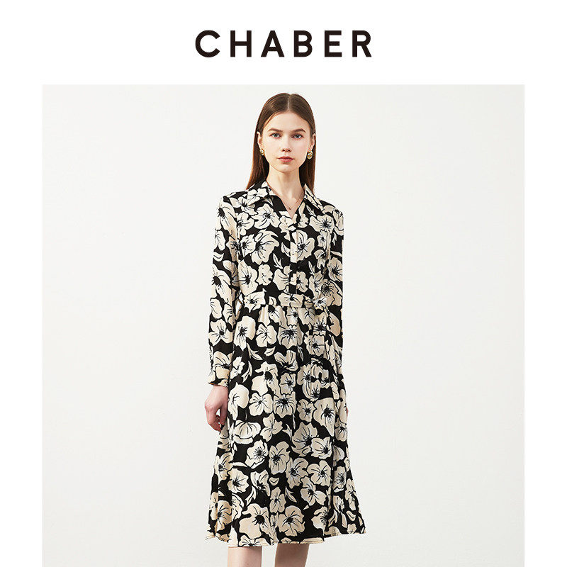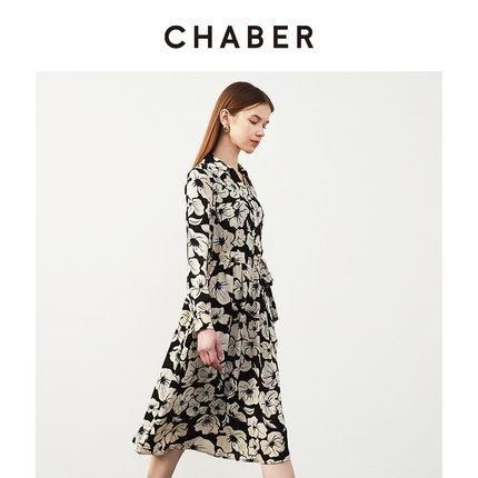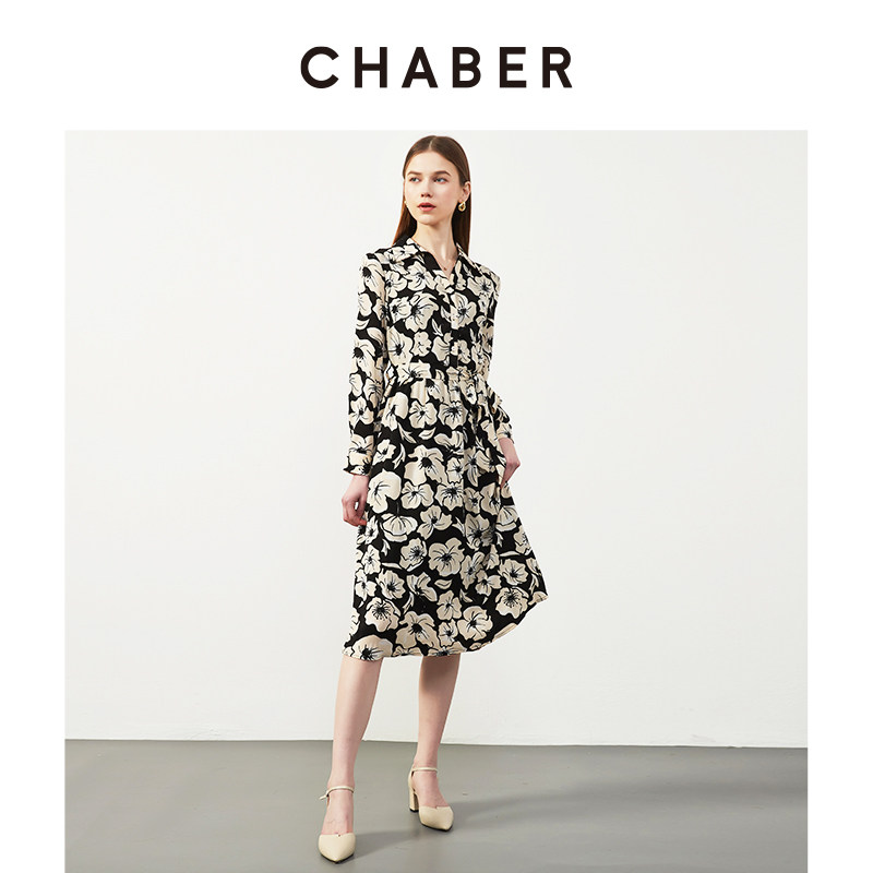 chaber巧帛春季新款V领印系带花衬衫裙设计感小众气质长袖连衣裙