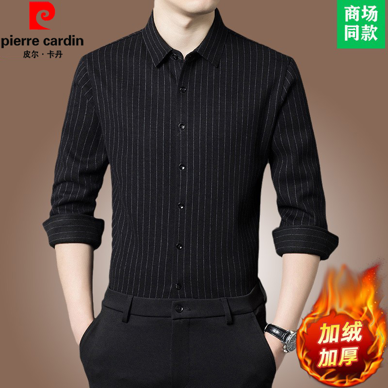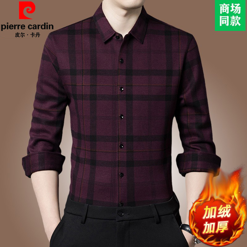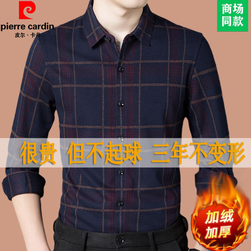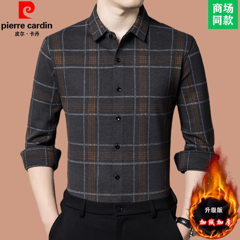 皮尔卡丹羊毛加绒衬衫男格子免烫保暖衬衣中青年长袖加厚寸衣男
