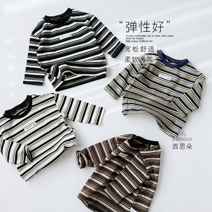 很百搭洋气 山系撞色条纹纯棉T恤男女春秋长袖打底衫宝宝圆领上衣