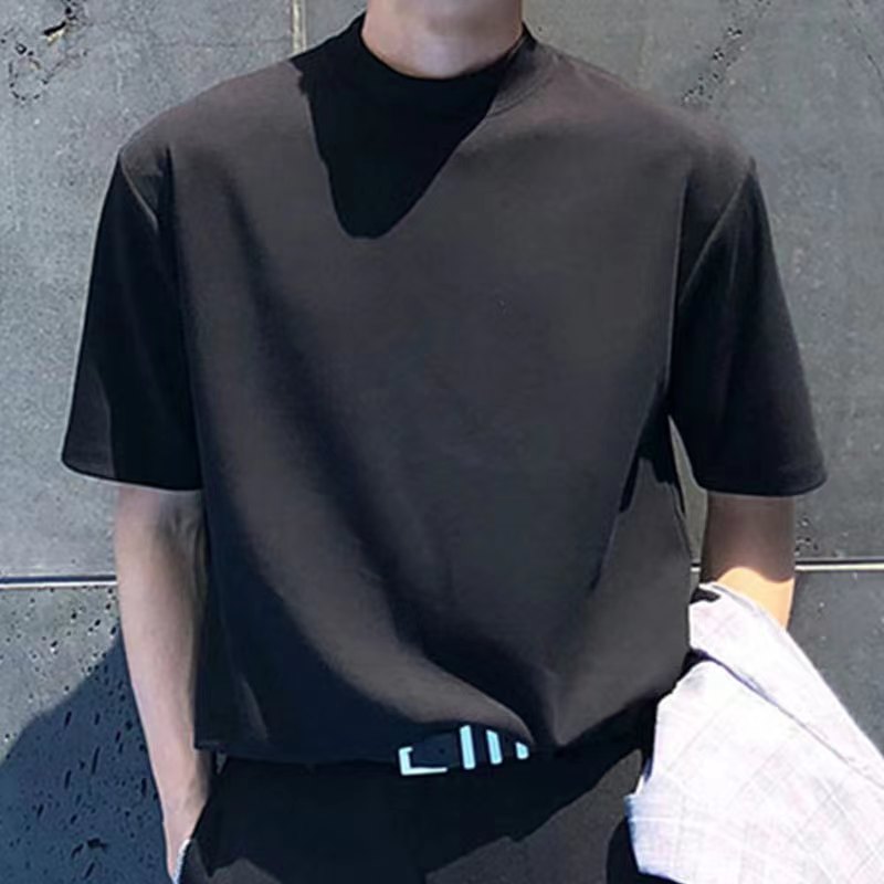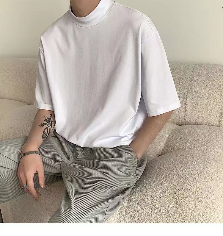 小高领T恤男重磅纯棉短袖宽松版加肥加大纯色半高领t恤男半袖体恤