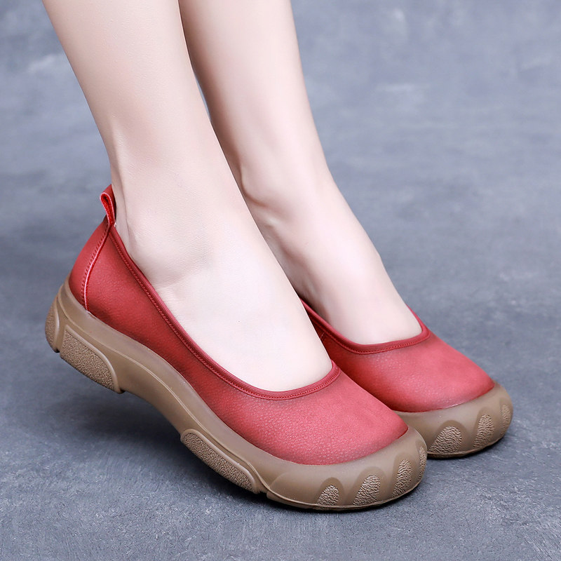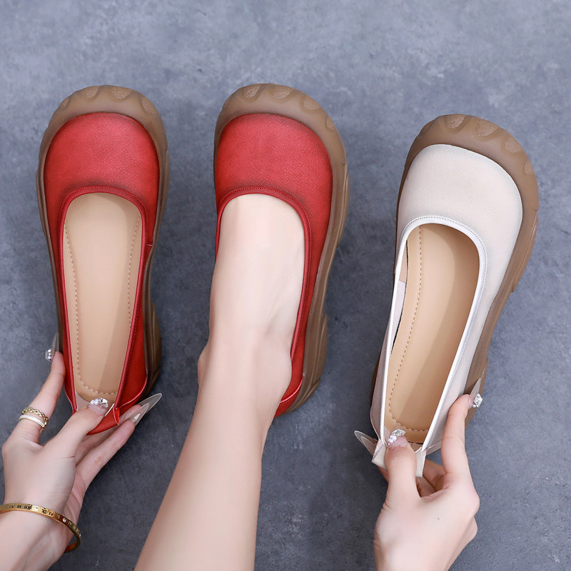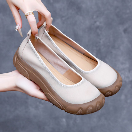真皮单鞋女春夏新款舒适厚底浅口豆豆鞋一脚蹬休闲中老年妈妈皮鞋