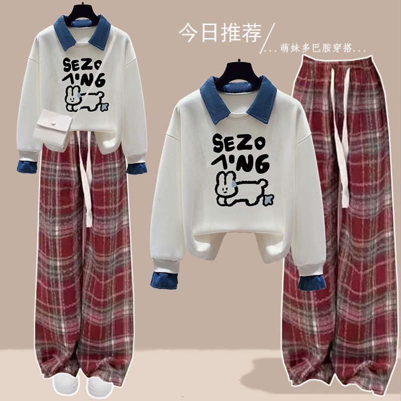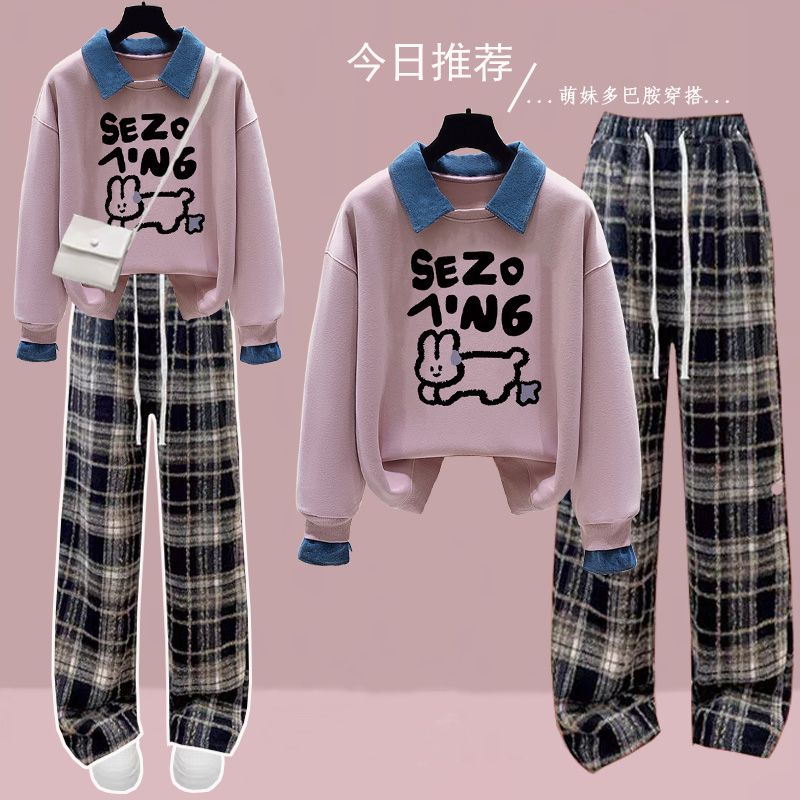春秋新款女大童假两件卫衣清新休闲格子裤少女小众外穿学院风套装
