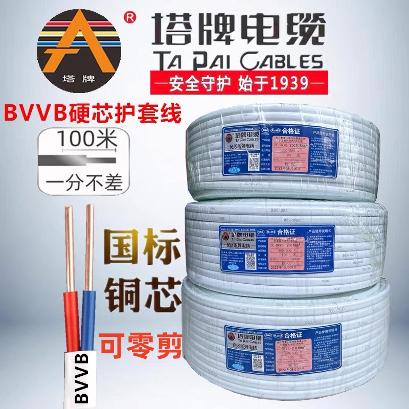 国标塔牌电线BVVB护套线硬芯阻燃电缆多股2芯3芯 1.5/2.5/4/6平方