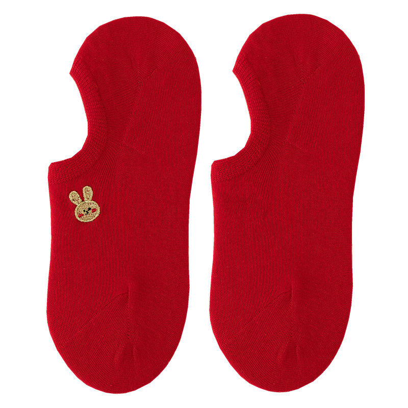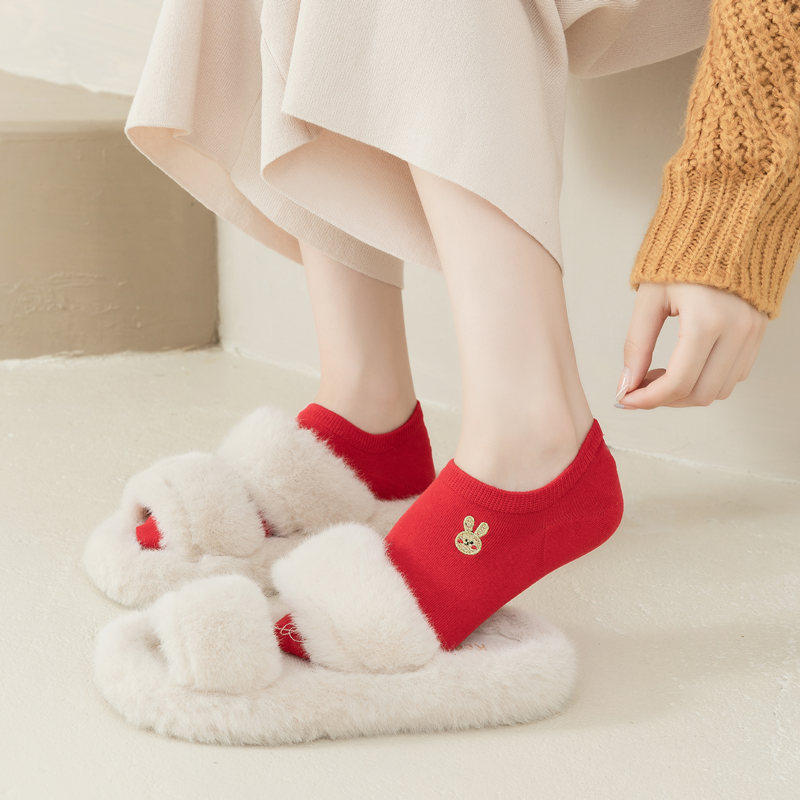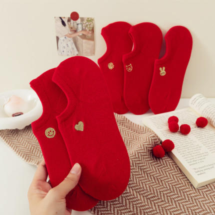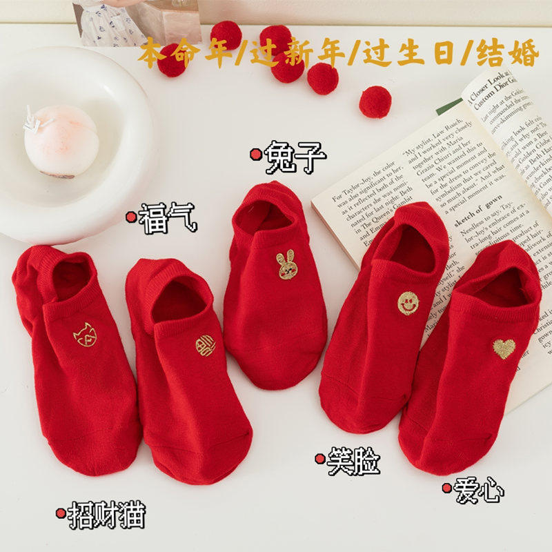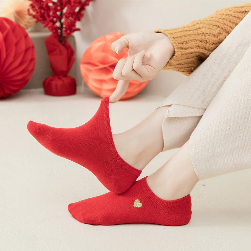 红袜子女属马本命年纯棉浅口船袜男女结婚情侣袜大红色低腰新年袜