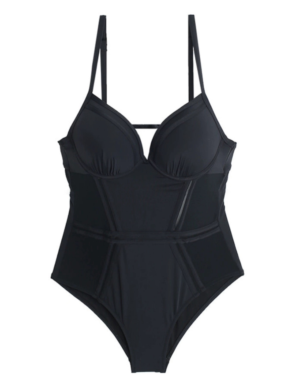 黑色吊带连体泳衣女韩国ins大胸钢托性感露背遮肚显瘦泡温泉网红