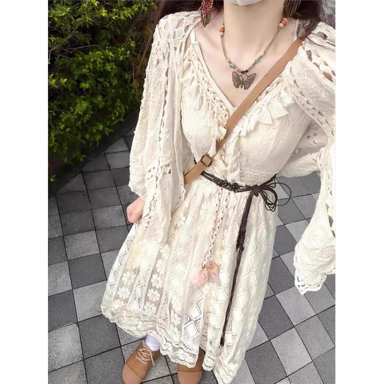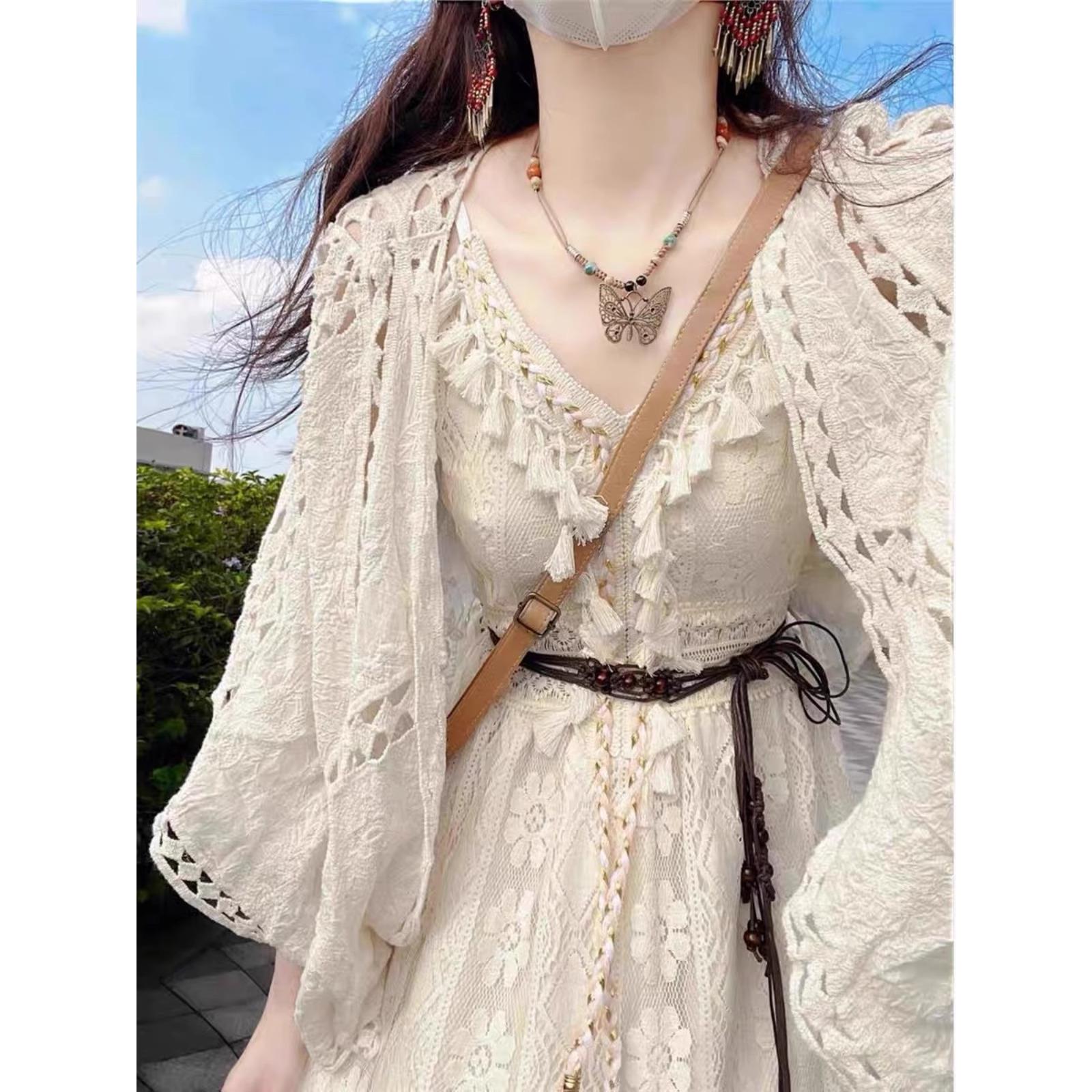 夏装搭配套装女大码胖mm波西米亚度假风防嗮开衫蕾丝吊带连衣裙子
