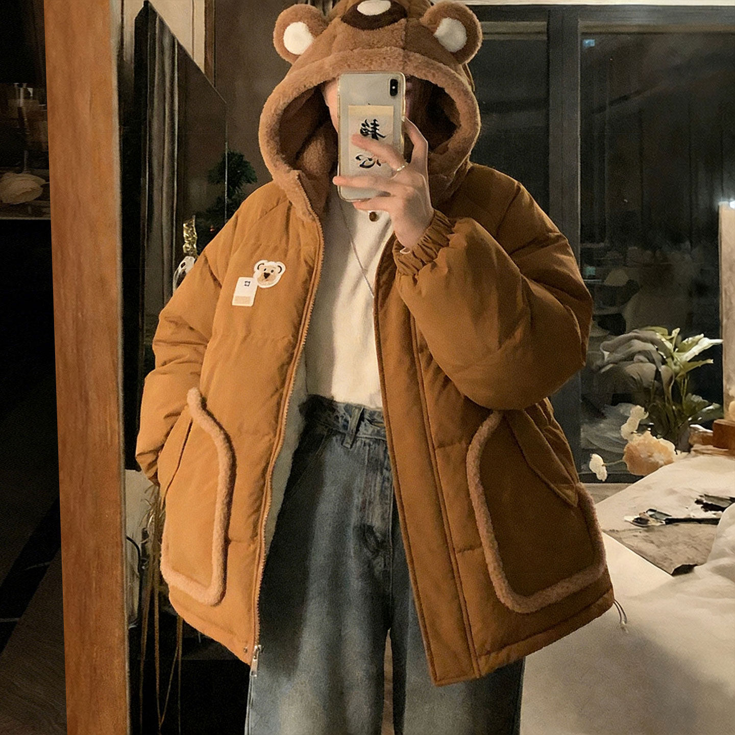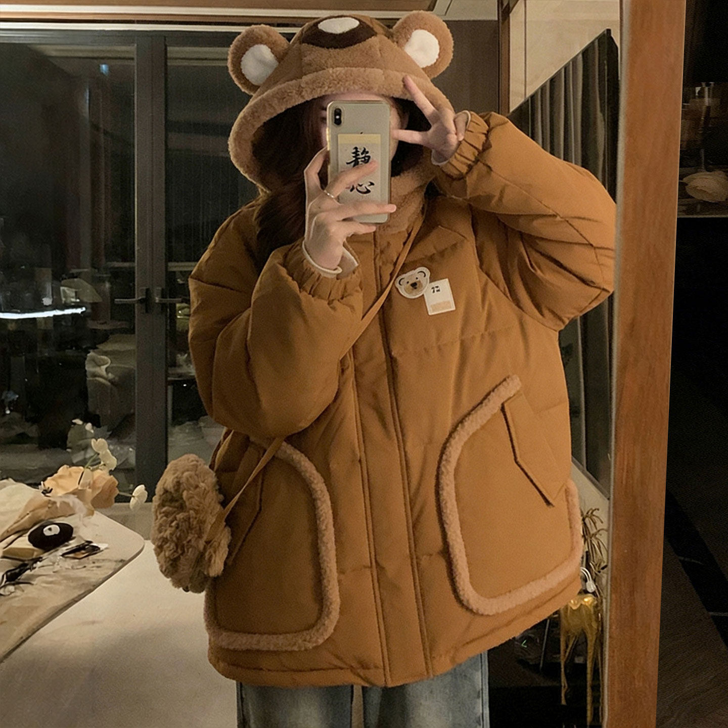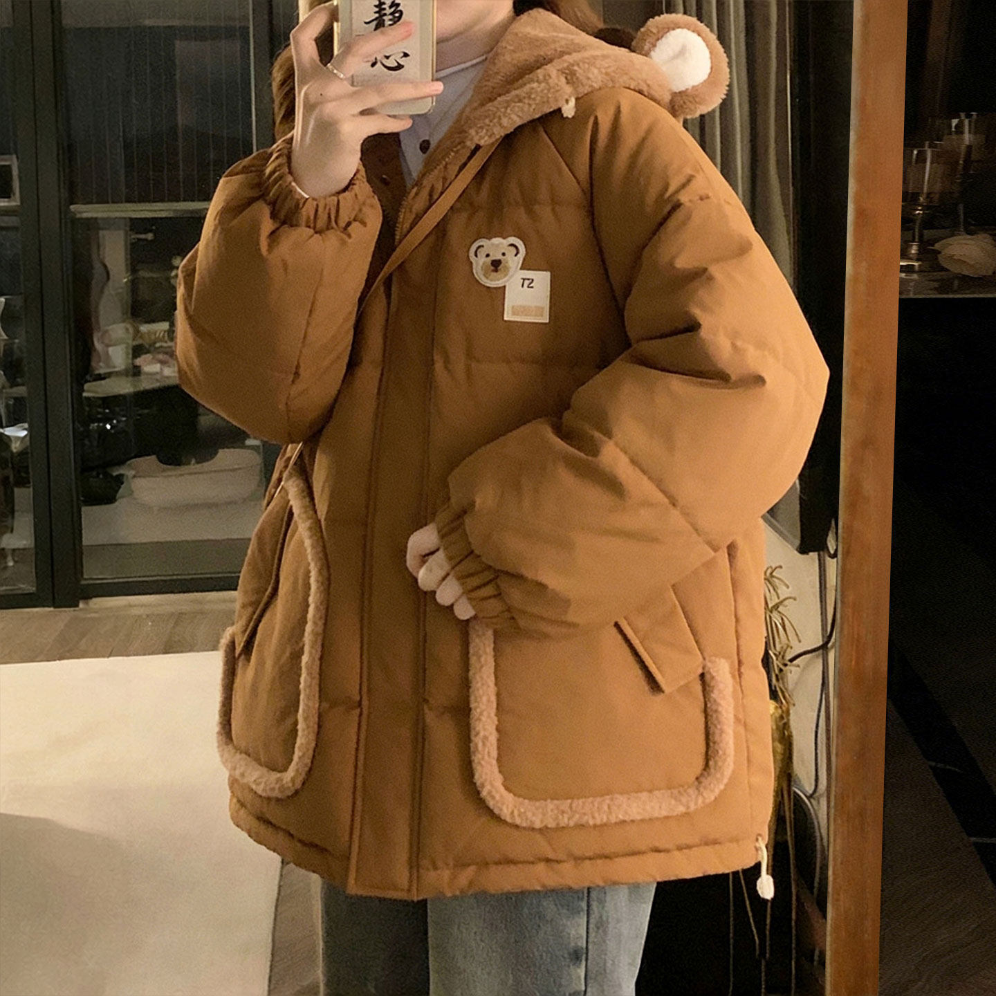 大码女装胖mm韩系超好看羽绒棉服女学生小熊耳朵连帽加厚保暖外套