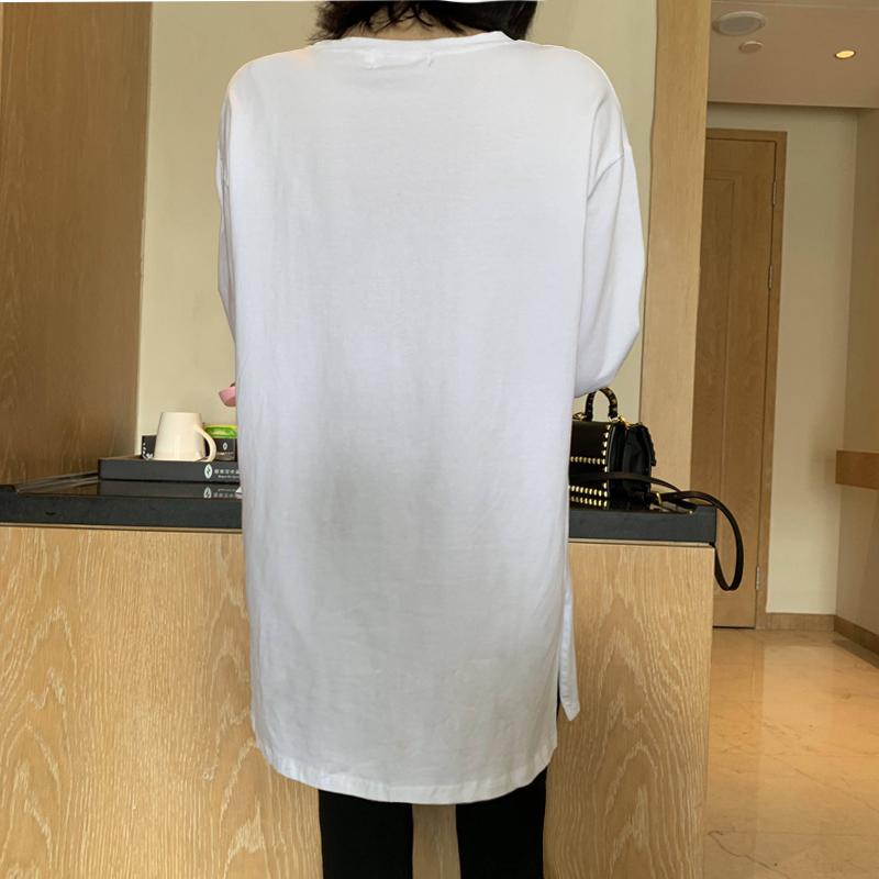 棉质t恤女秋冬休闲内搭中长款韩版宽松大码纯白打底长袖上衣开叉