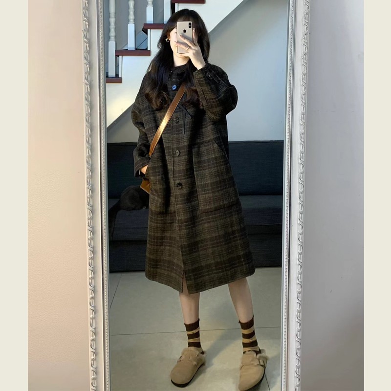 代购sly 复古格子连帽中长款毛呢外套女秋冬季新款设计感呢子大衣