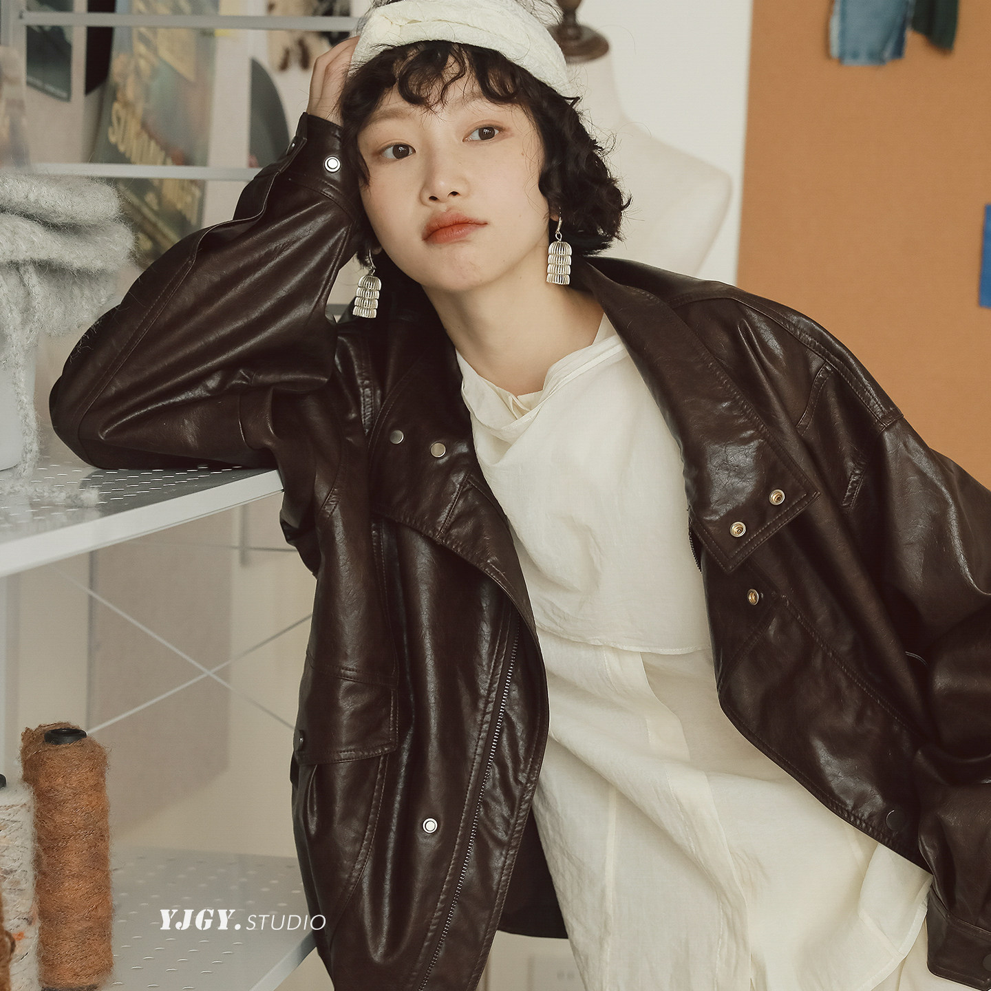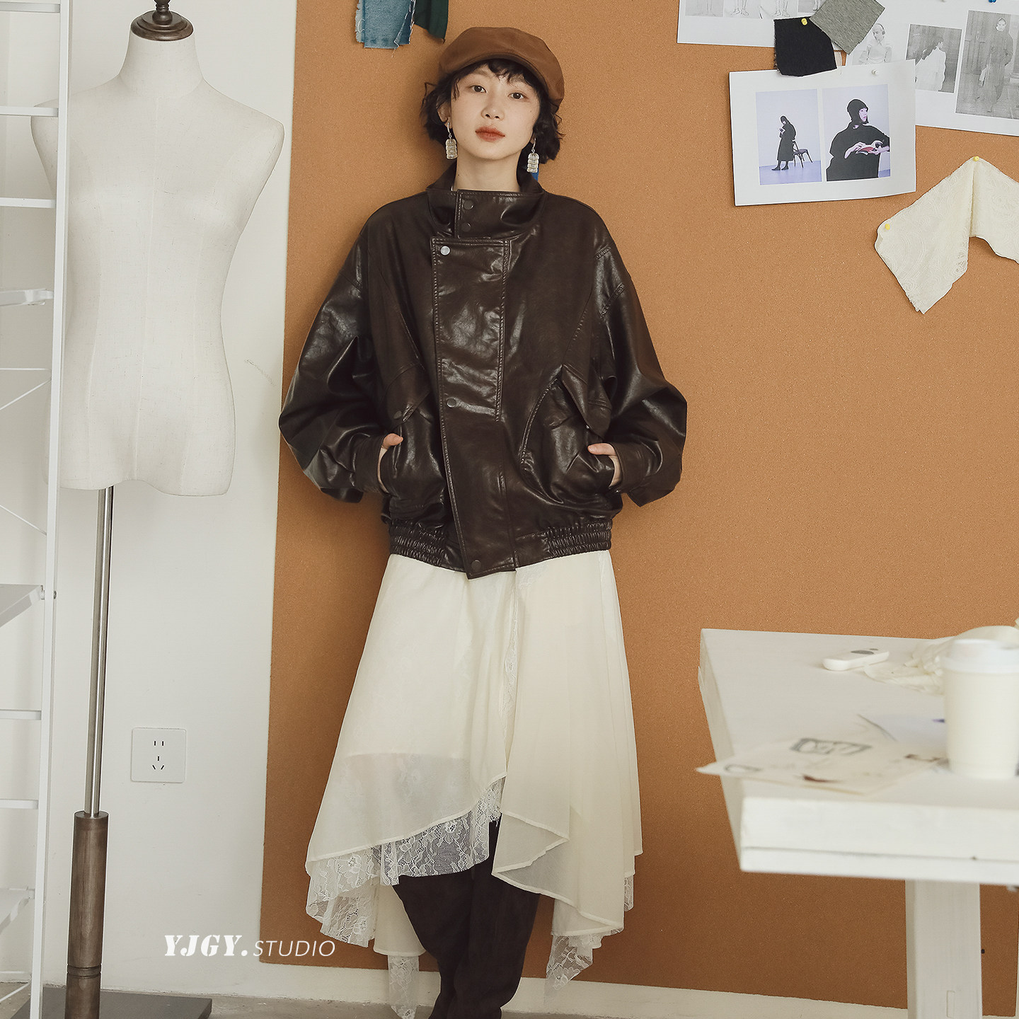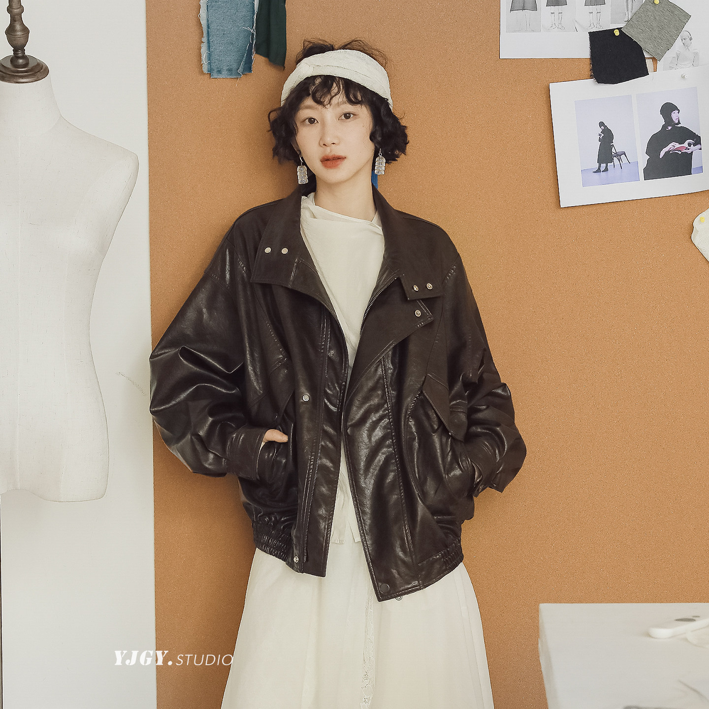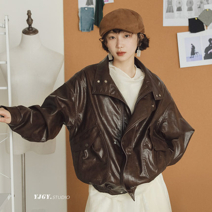 美拉德做旧柔皮肌理感翻领油蜡皮衣女复古机车男友风PU皮外套夹克