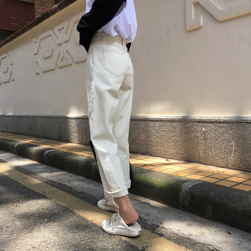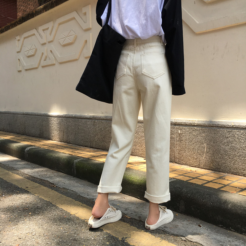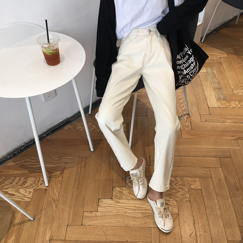 春秋新款韩版chic风半松紧高腰显瘦宽松阔腿裤直筒纯色牛仔裤长裤