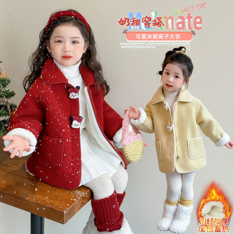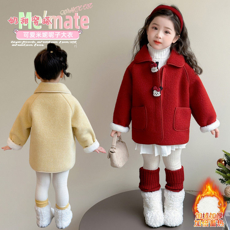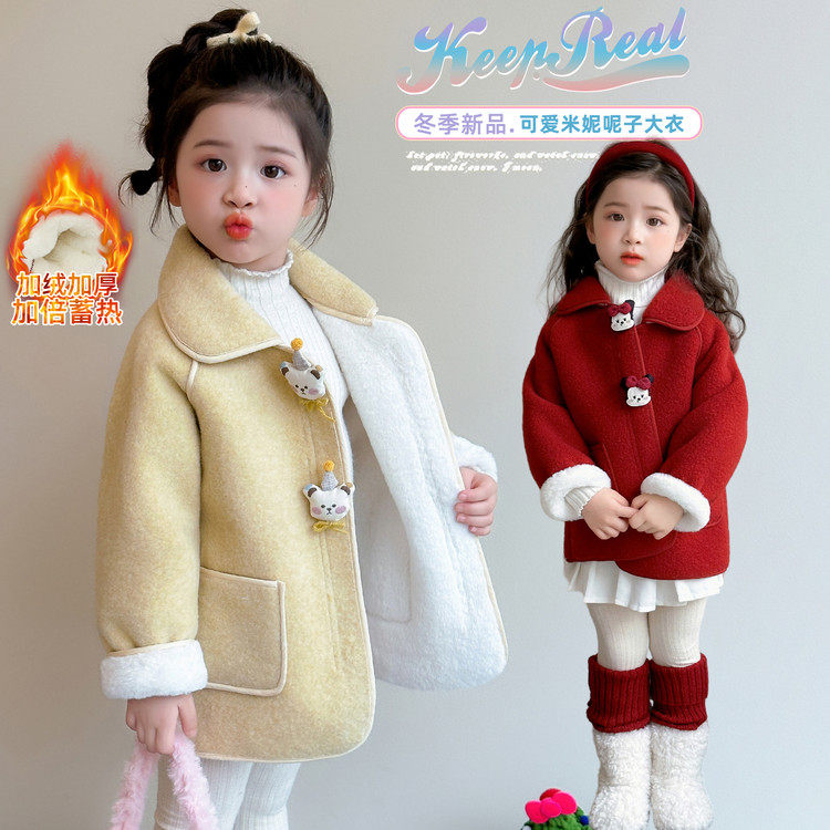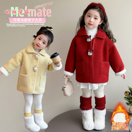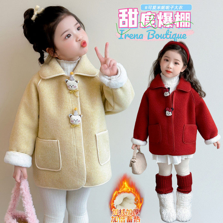 女童时髦加绒外套冬季2025新款女宝宝韩版毛呢大衣儿童加厚上衣潮