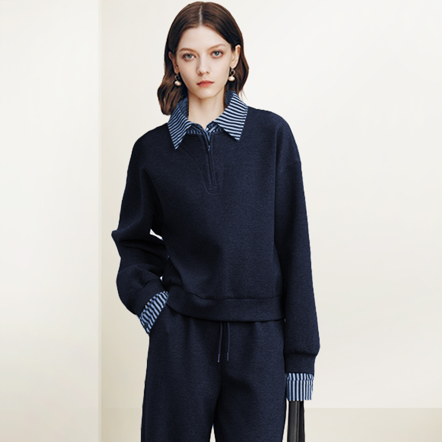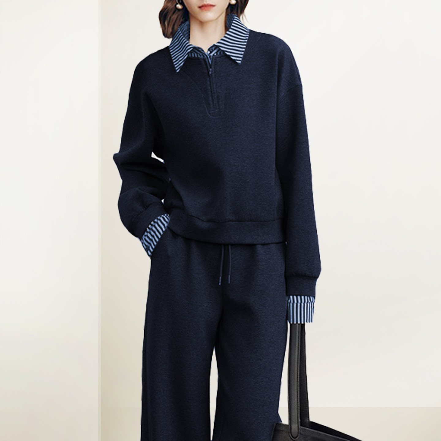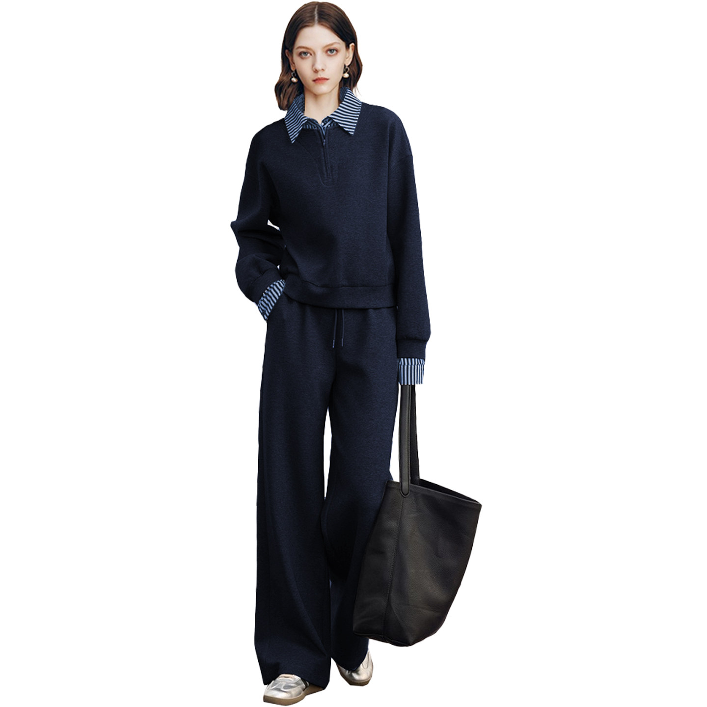 QOOEL时尚减龄复古两件装女2025秋冬新款衬衫领卫衣裤子整套穿搭
