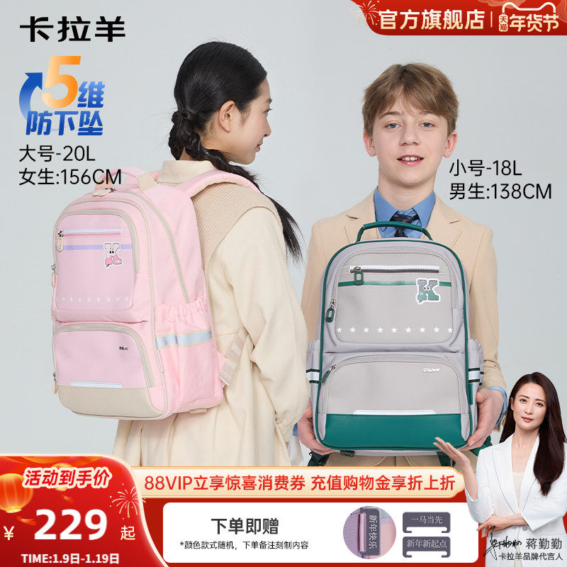 卡拉羊中小学生风琴书包防下坠减负大容量女初中生轻便双肩包男