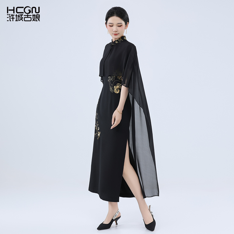 国风夏季女士修身外披立领纯色微奢设计感龙刺绣两件套旗袍连衣裙