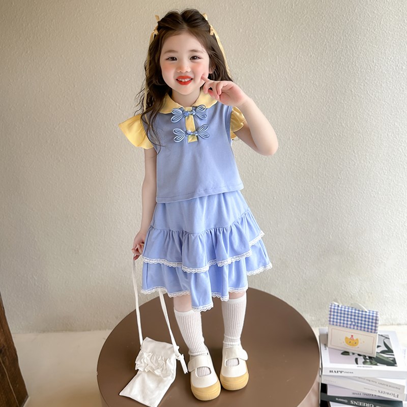女童套装夏装2025新款时髦洋气女孩宝宝夏款夏季飞袖百褶裙两件套