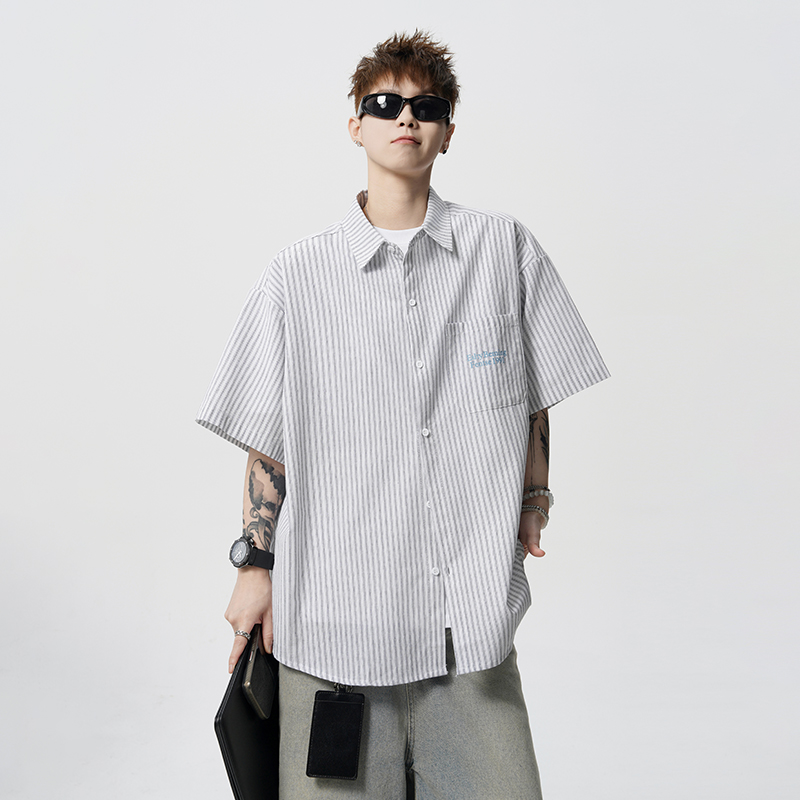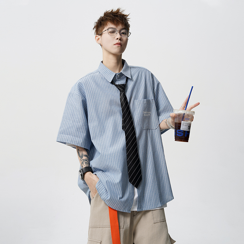 V37日系工装短袖衬衫男2025新款秋季潮牌cityboy宽松条纹半袖衬衣
