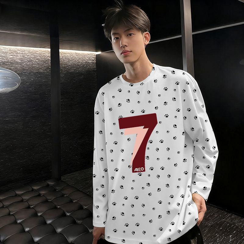 美式重磅纯棉脚印白色长袖百搭小众潮牌印花上衣男士ins风宽松t恤