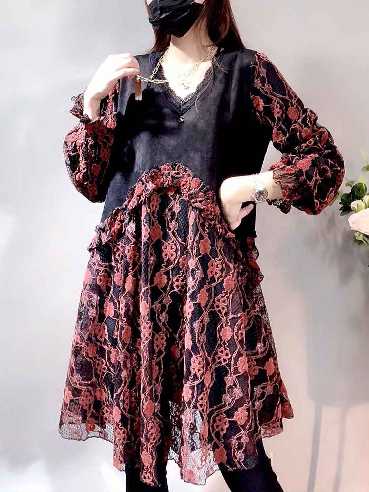 长袖设计感小众女加绒打底衫V领冬季套头蕾丝拼接连衣裙显瘦时尚